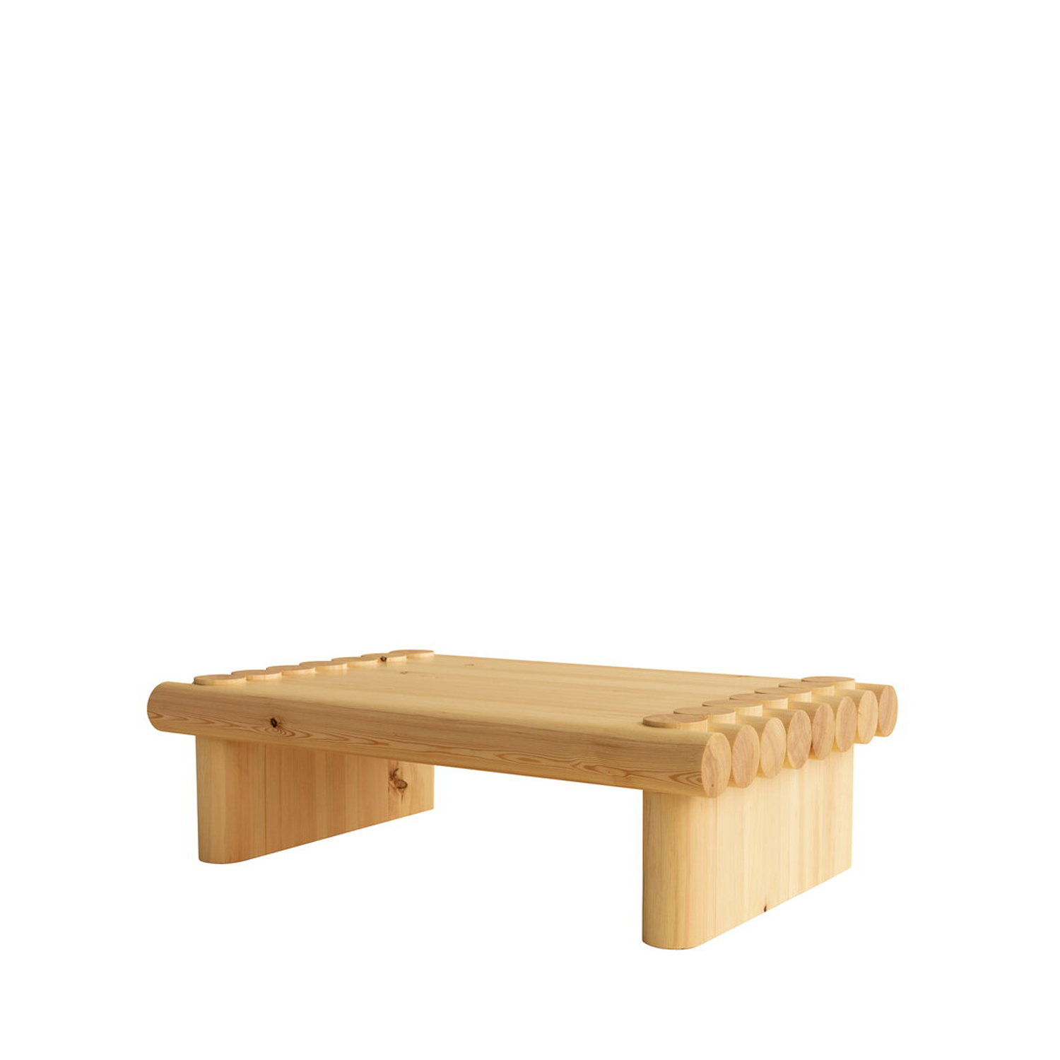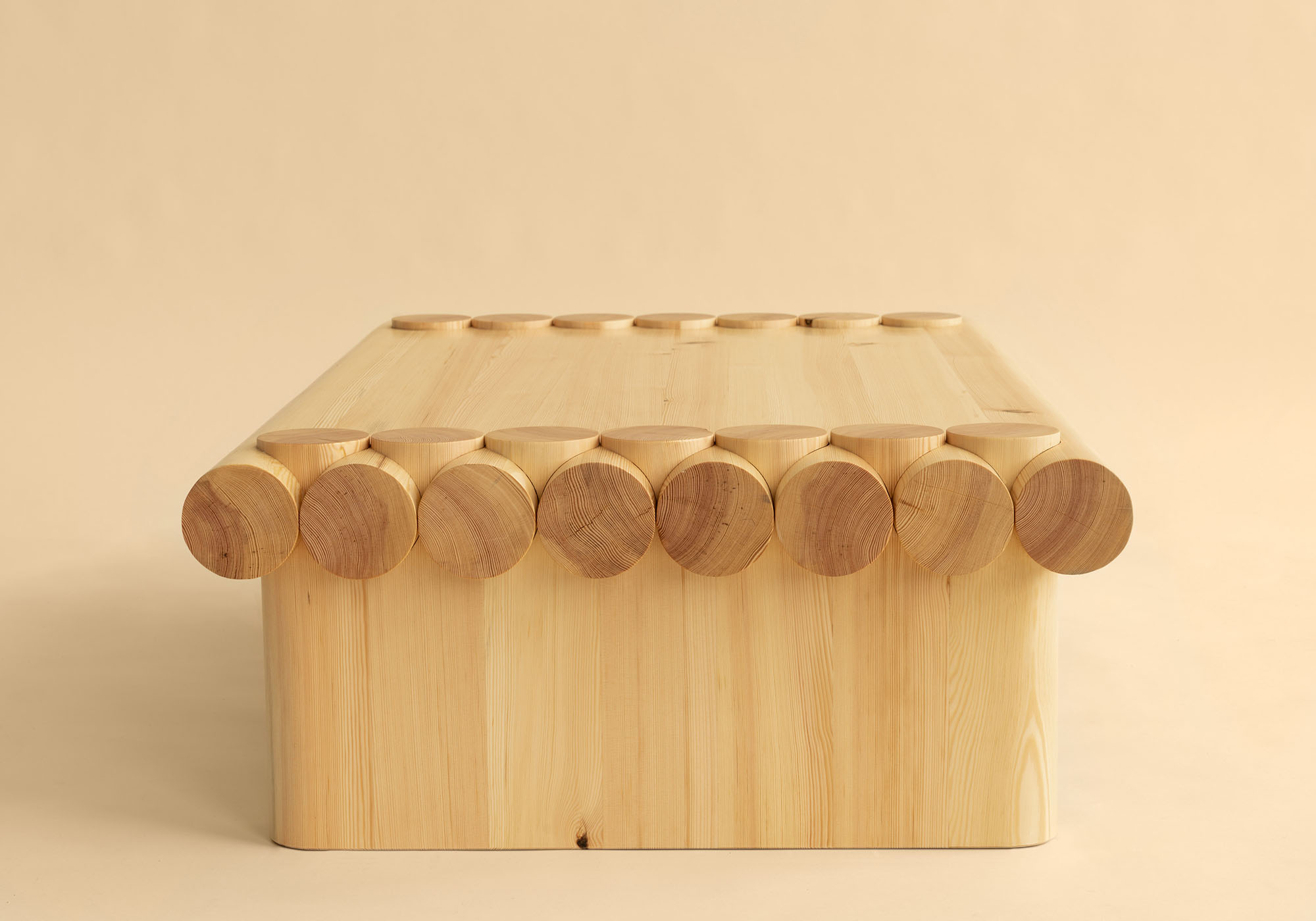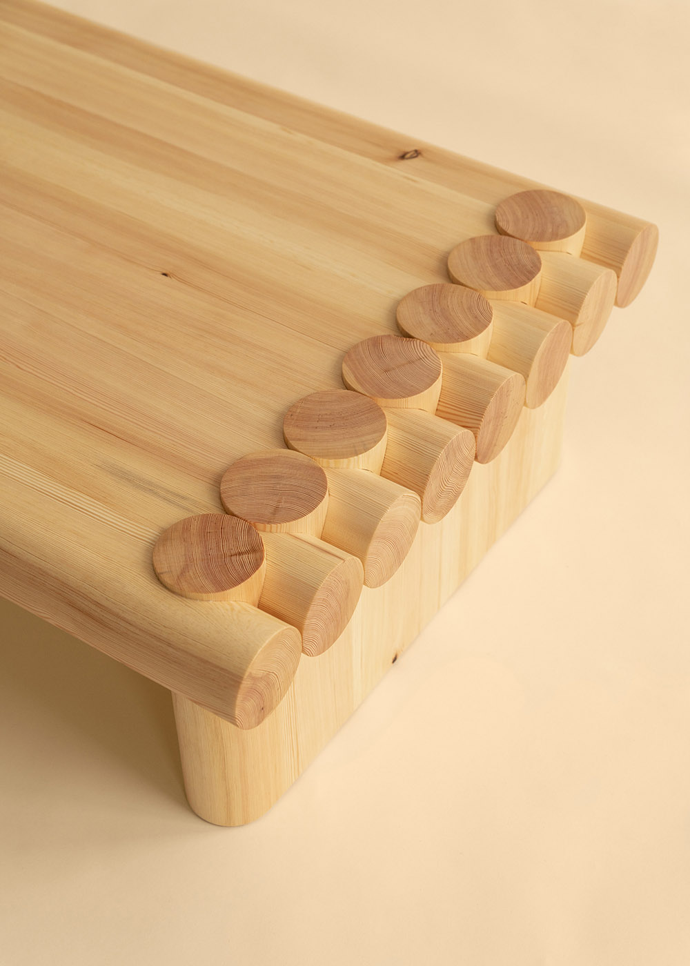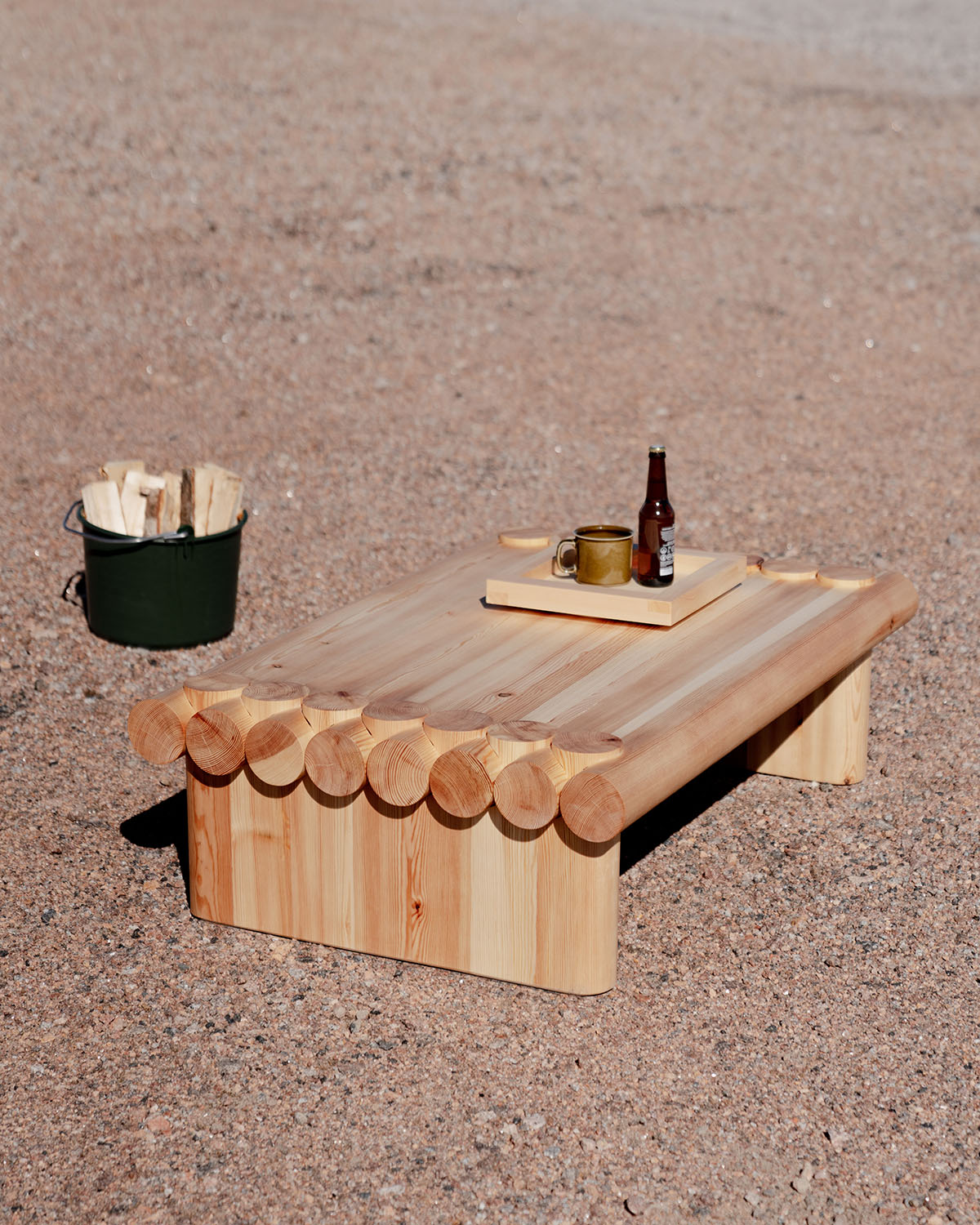 The honest qualities of pine are boldly expressed in Soft Baroque’s Coffee Table. The satisfyingly rational joints of traditional Finnish log houses, themselves a celebration of elementary wooden construction, have been used to decorative effect in this most solid of tables. Round notch joints have been inflated to ‘comic proportions’ by Soft Baroque, who predict that their substantial table will outlive any of its owners and largely be used for dancing on, given its hulking proportions.