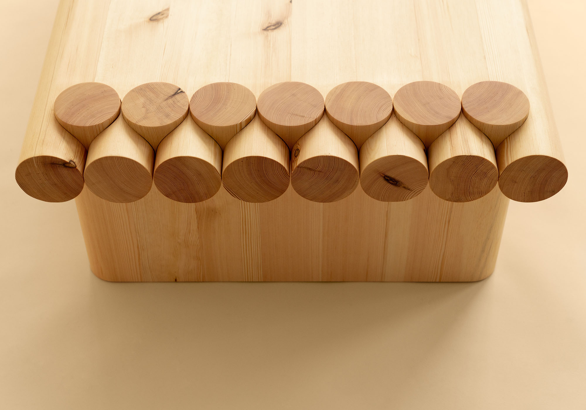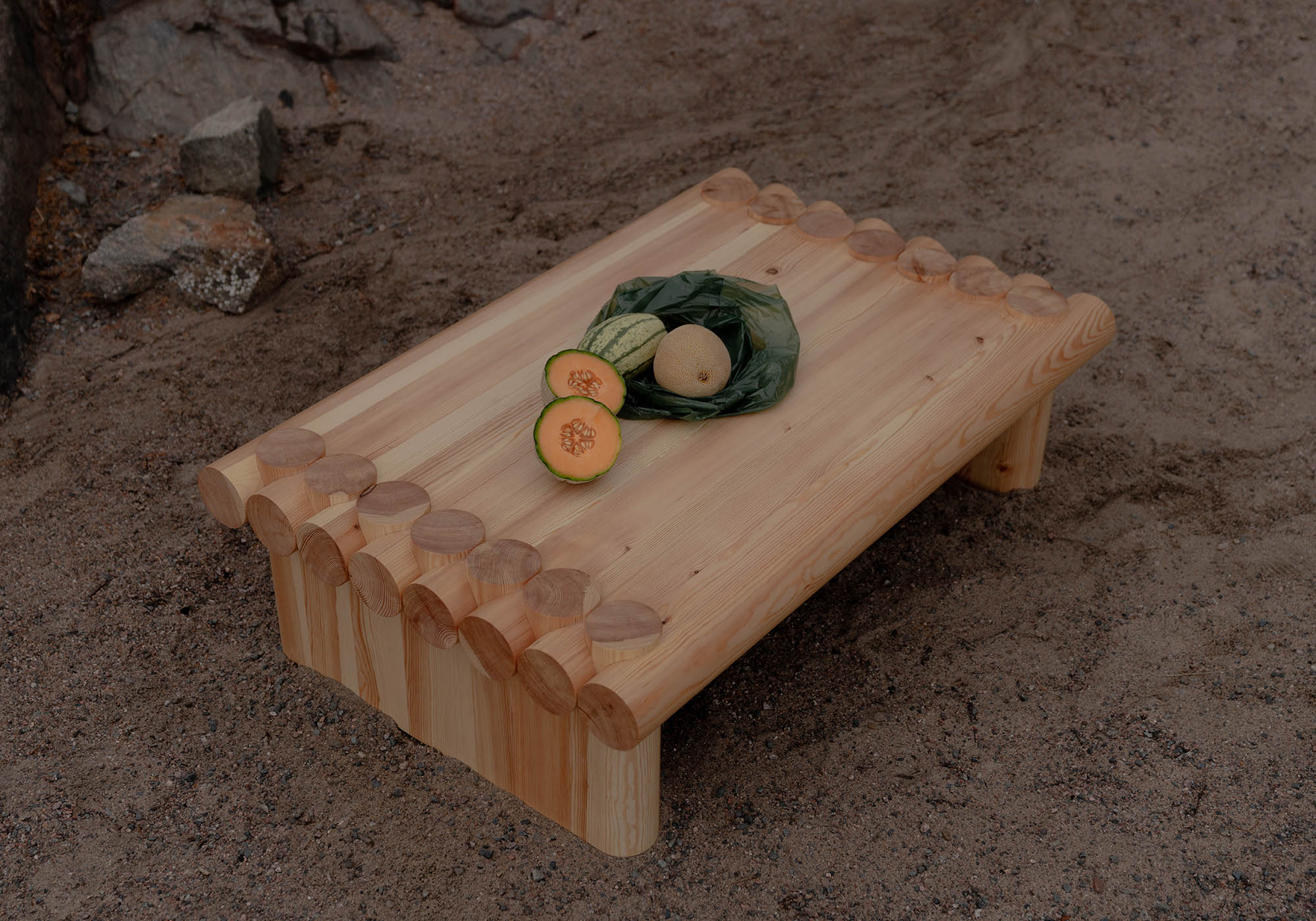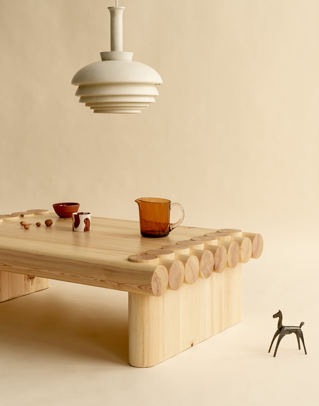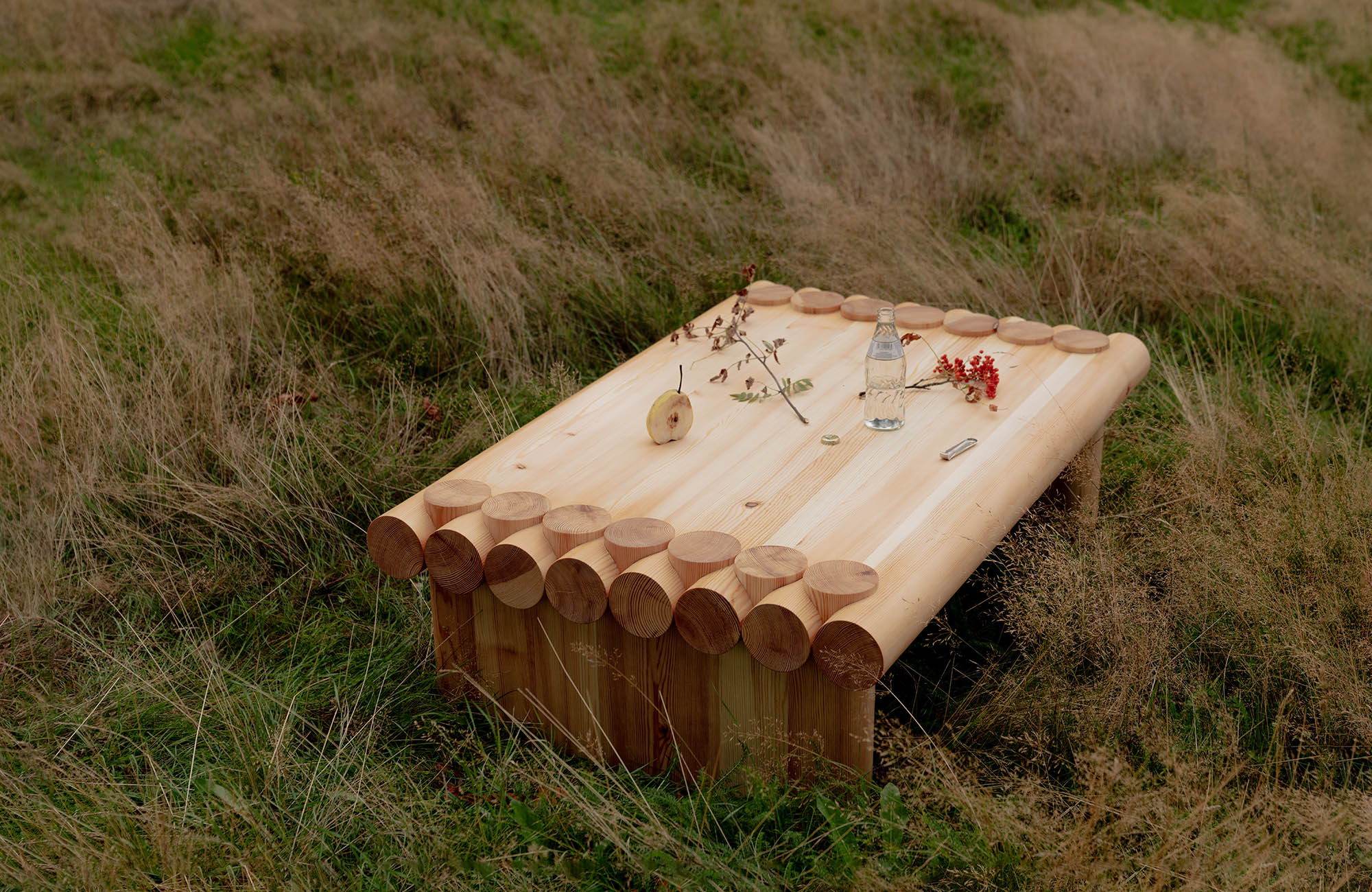 The honest qualities of pine are boldly expressed in Soft Baroque’s Coffee Table. The satisfyingly rational joints of traditional Finnish log houses, themselves a celebration of elementary wooden construction, have been used to decorative effect in this most solid of tables. Round notch joints have been inflated to ‘comic proportions’ by Soft Baroque, who predict that their substantial table will outlive any of its owners and largely be used for dancing on, given its hulking proportions.