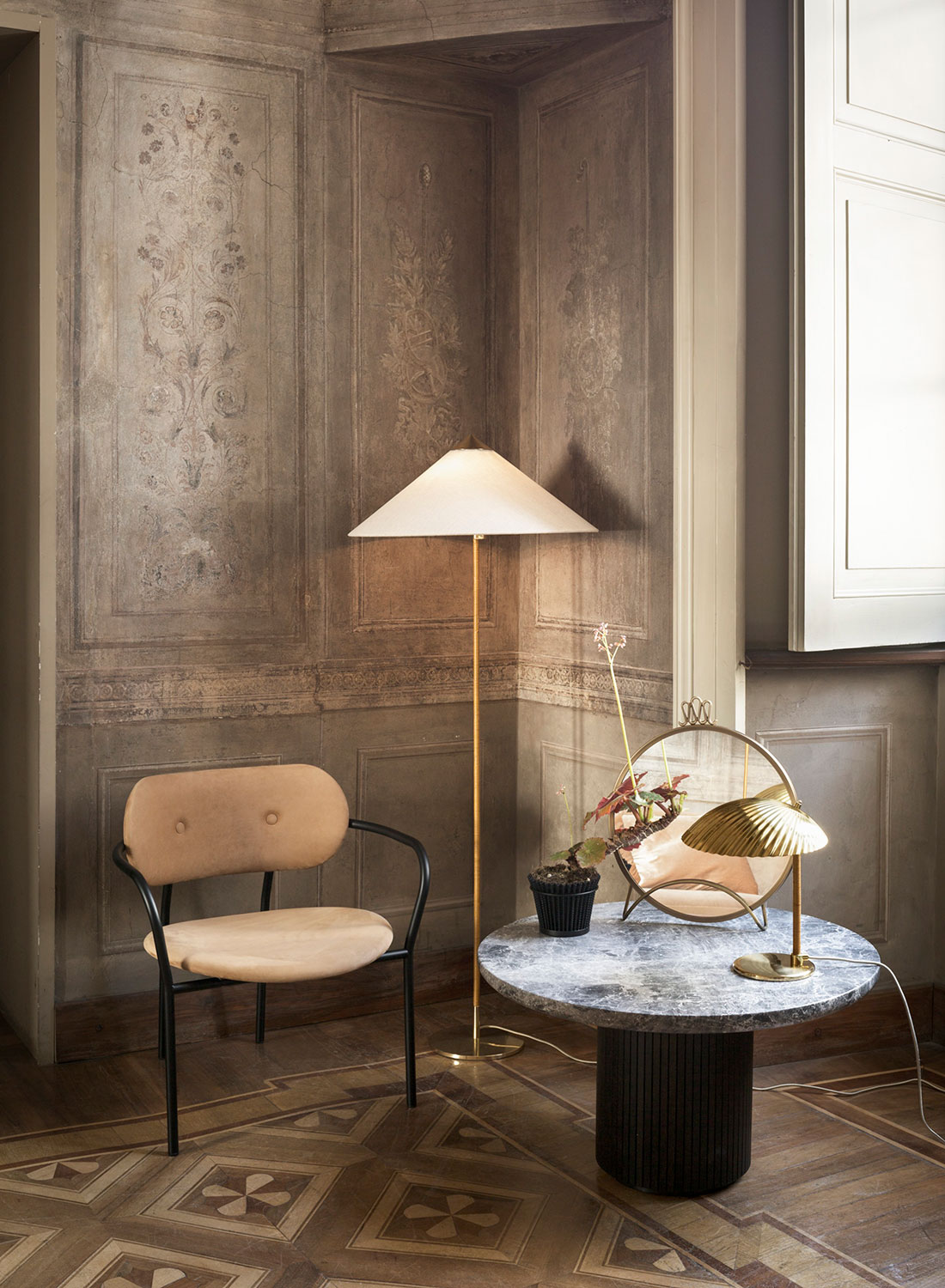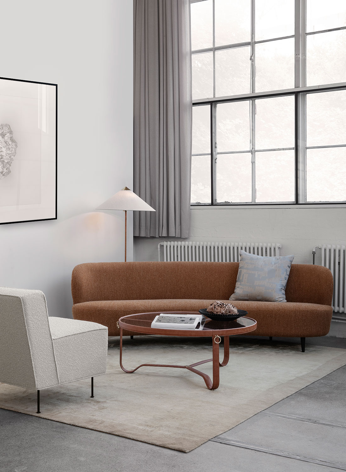 The 9602 Floor Lamp, also known as “Chinese Hat” was designed by Paavo Tynell in 1935 for the Hotel Aulanko. Characterised by its elegant and airy lampshade and rattan-covered stem, the 9602 Floor Lamp shows the designer’s limitless imagination and unparalleled ability to create designs of enduring beauty. Adding a playful, exuberant quality to the top, balanced by the more static form of the base, the 9602 Floor Lamp is perfectly suited for creating a gentle ambient light in the domestic living room.