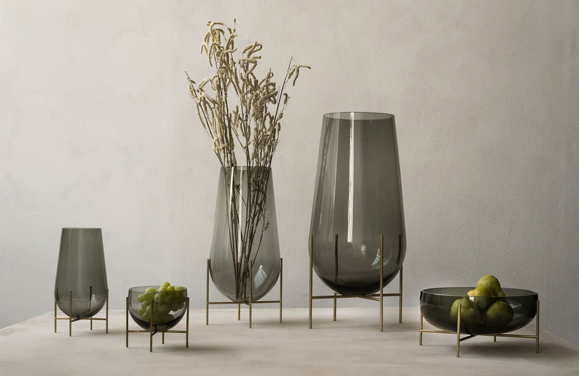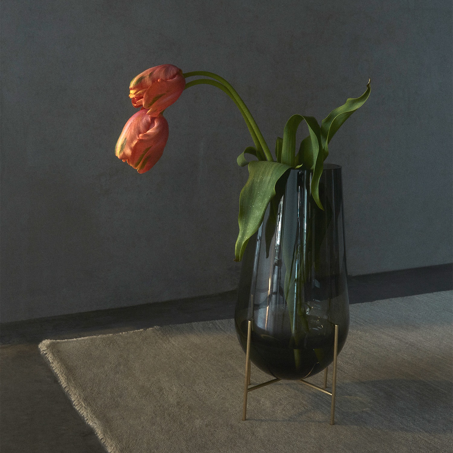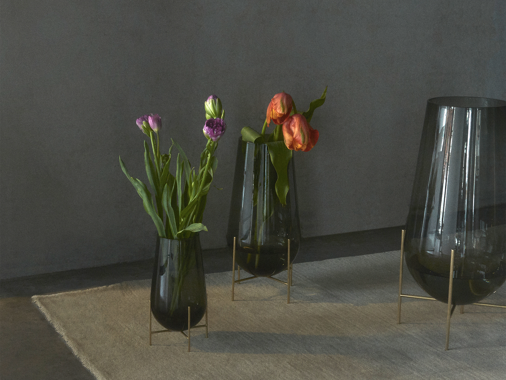 The first piece in the now-iconic series was inspired by laboratory test tubes. The drop-shaped form is as elegant when holding flowers on a desk, living room floor, or nightstand as it is when left unfilled. The smoked glass version with brushed brass legs is available in three sizes. The unique colour gradients of the glass give the design depth and contrast against the legs’ clean lines. The smallest vase is now available with clear glass and bronzed brass legs; a classic pairing to complement any interior palette, in a size ideal for more compact spaces.