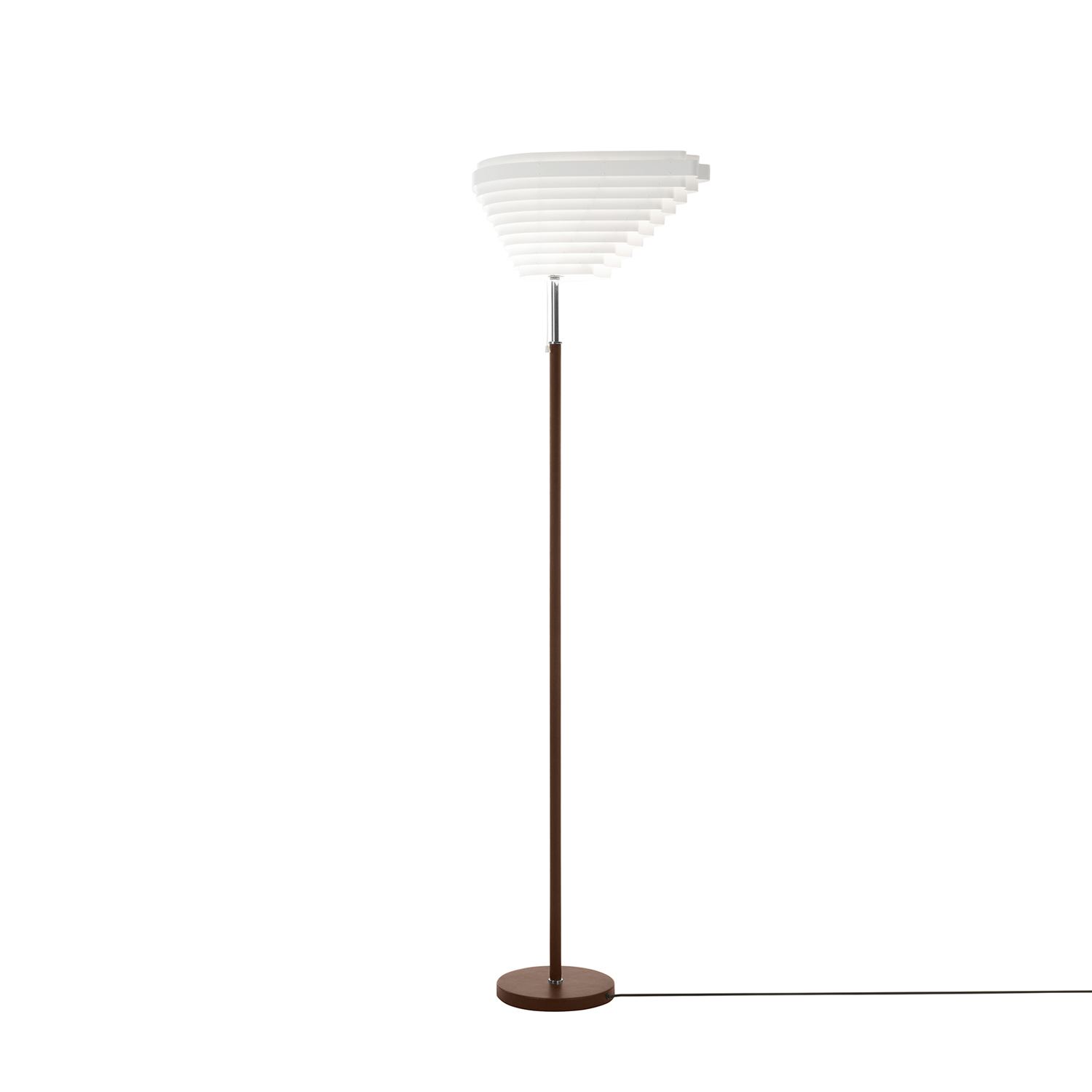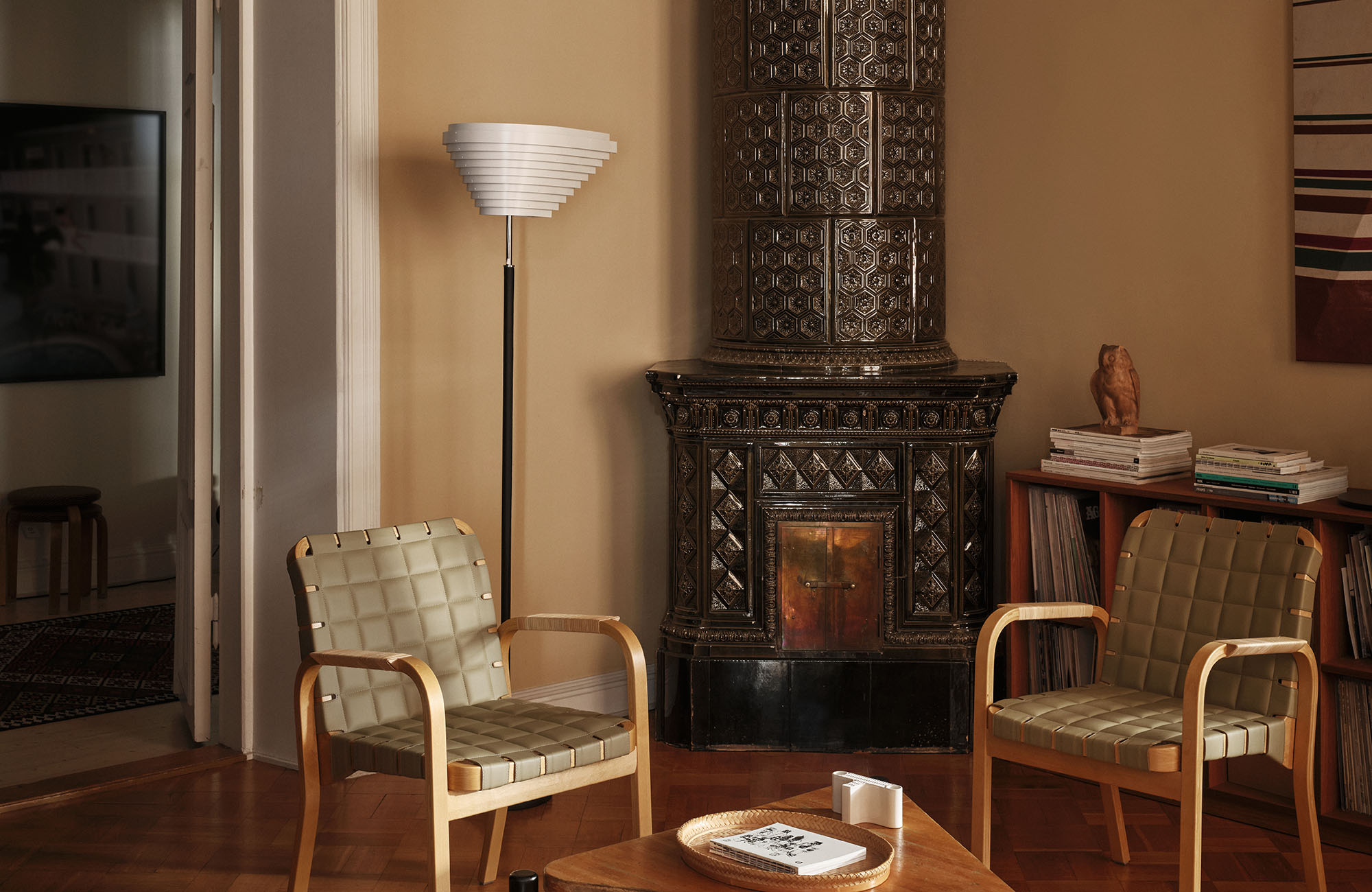 Floor Light A805 features a hand-riveted shade formed from delicate, lacquered metal strips. It presents a striking combination of lines and curves while allowing for an interesting interplay of direct and indirect light. A polished brass collar provides appealing contrast with the white shade, and the black leather finish of the stand is hand sewn in Finland. The asymmetrical shape is reminiscent of an angel’s wing – hence the nickname. “Angel Wing” was designed by Alvar Aalto in 1954 for the National Pensions Institute in Helsinki.