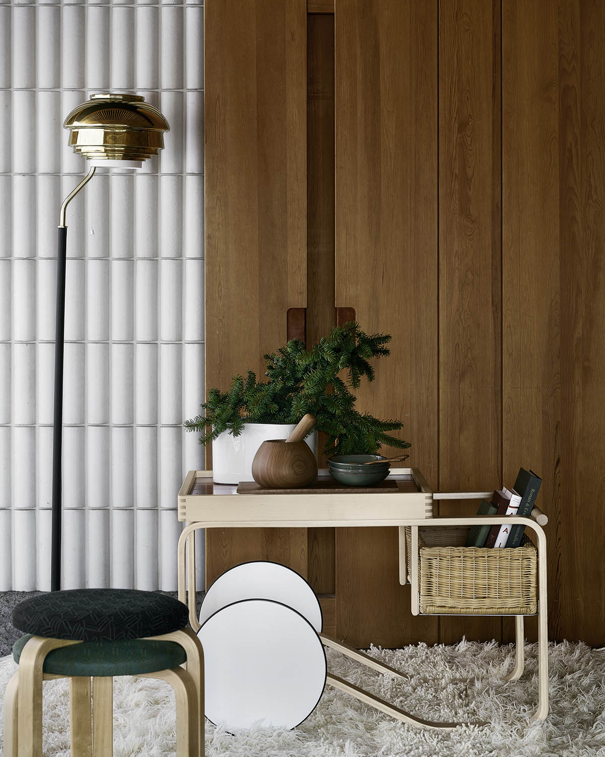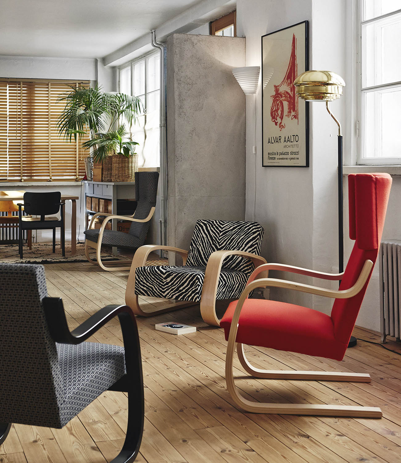 The hand-turned shade of this elegant floor light is made of delicate, lacquered metal strips that prevent glare by diffusing light evenly. The strips form concentric circles of increasing size that combine to form an inverted bowl shape. The slender angled neck has a polished brass collar that contrasts appealingly with the stand’s black leather finish, which is hand-sewn in Finland. The light was designed by Alvar Aalto in 1955 for the National Pensions Institute in Helsinki.
