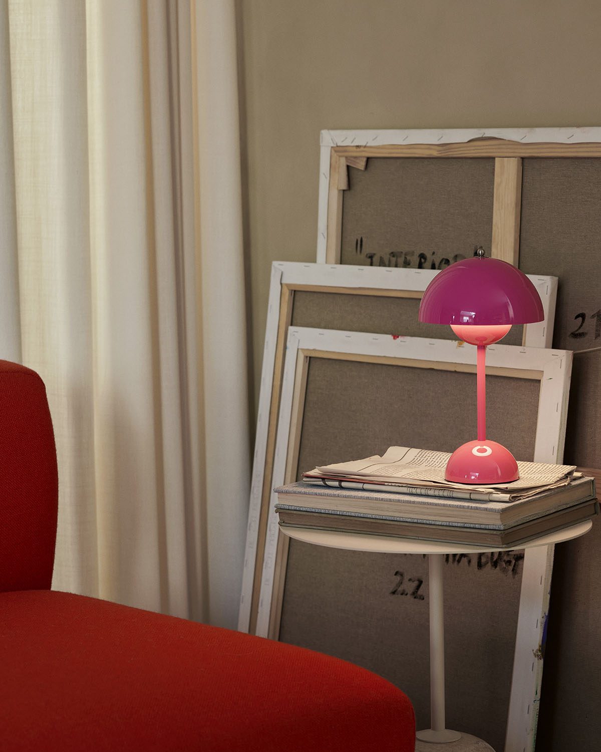 Among the most norm-breaking Danish designs of the 1960s, the iconic form of Verner Panton’s Flowerpot is available in a series which now consists of seven different models. In close collaboration with the Panton family, we are pleased to welcome five new and exciting, vibrant colours to our range for 2023: Cobalt Blue, Swim Blue, Vermilion Red, Tangy Pink, Dark Plum. Slightly smaller in size than the table lamp version, and deliberately lightweight, the portable VP9 comes equipped with a USB charging cable, bringing a cozy atmosphere to both indoor and outdoor settings.