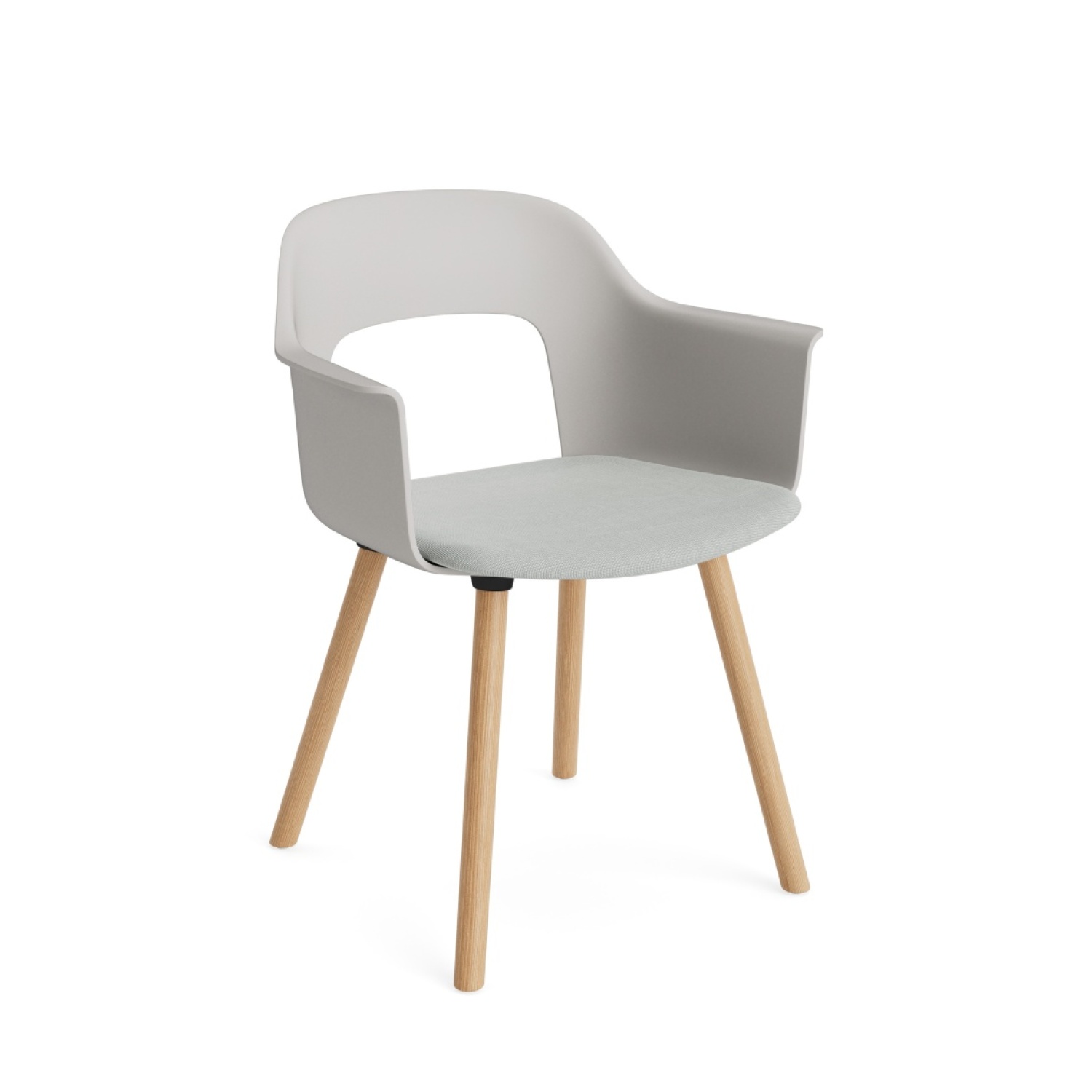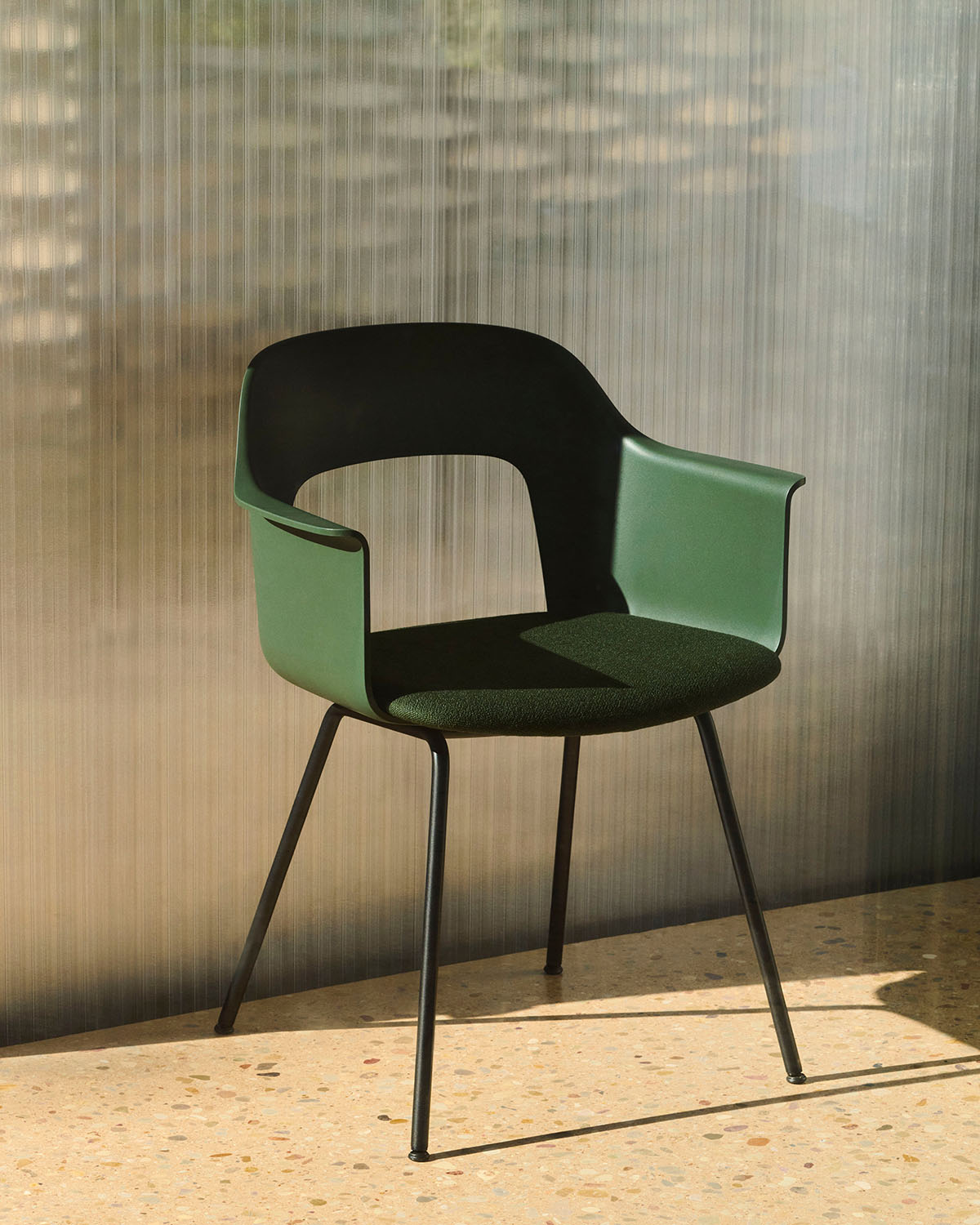 Designed by Julien Renault, Layout Armchair 223 offers a flexible and innovative design shaped by a commitment to comfort, functionality, and circularity. Characterised by the opening in the backrest, this defining feature provides greater comfort while giving its appearance a sense of lightness and transparency. Featuring an upholstered seat for a warm, inviting expression and rounded wooden legs that provide stability and a timeless appeal, all chair components can be fully disassembled to extend its lifespan and enable refurbishment for long-term use. The shell is crafted from a minimum of 96% post-consumer recycled plastic and offered in a wide range of colours. The base is offered in different wood types, with the upholstered seat available in a variety of fabric and olive-leaf tanned leather options, making Layout a versatile and durable seating solution ideal for most corporate settings and domestic environments.