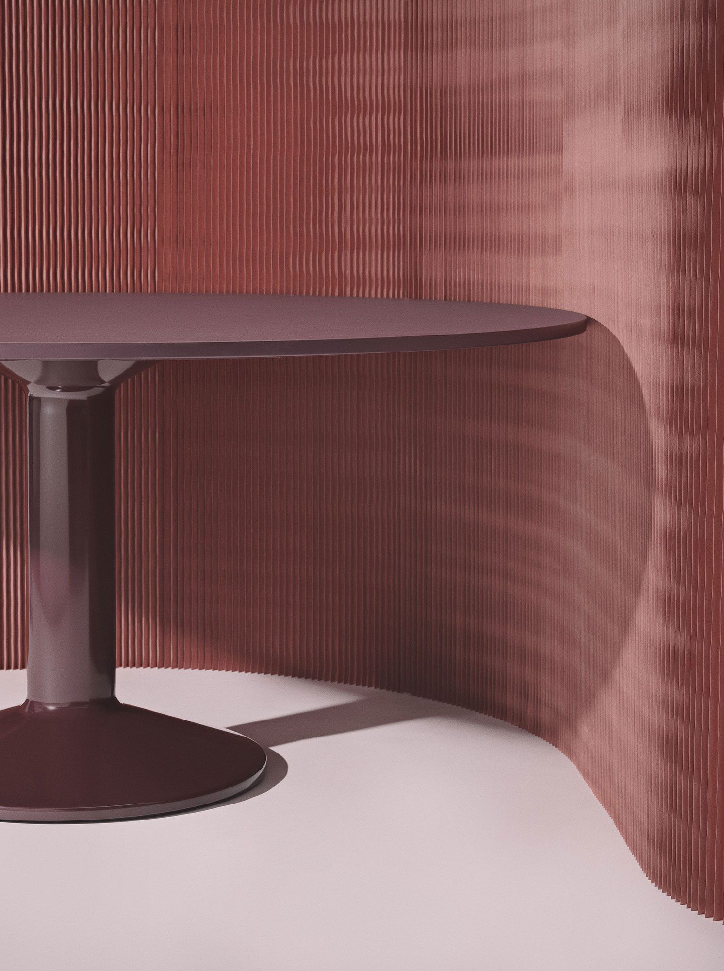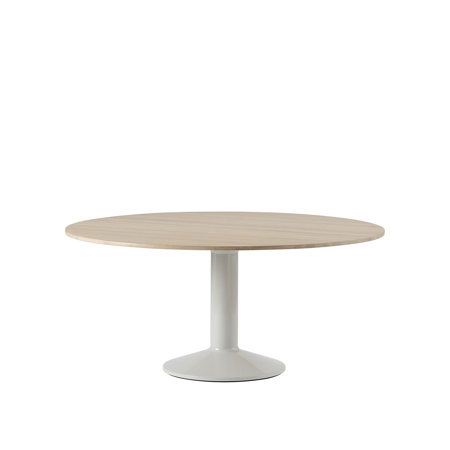 A natural focal point of the home, the Midst Table is a generous, round dining table where friends and family gather — and there is always room to squeeze in one more guest. Its refined silhouette is simple yet characteristic, enhanced by distinct detailing and contrasting materiality; matte solid oak or linoleum on a monolithic base made of spun steel with a durable high gloss finish.