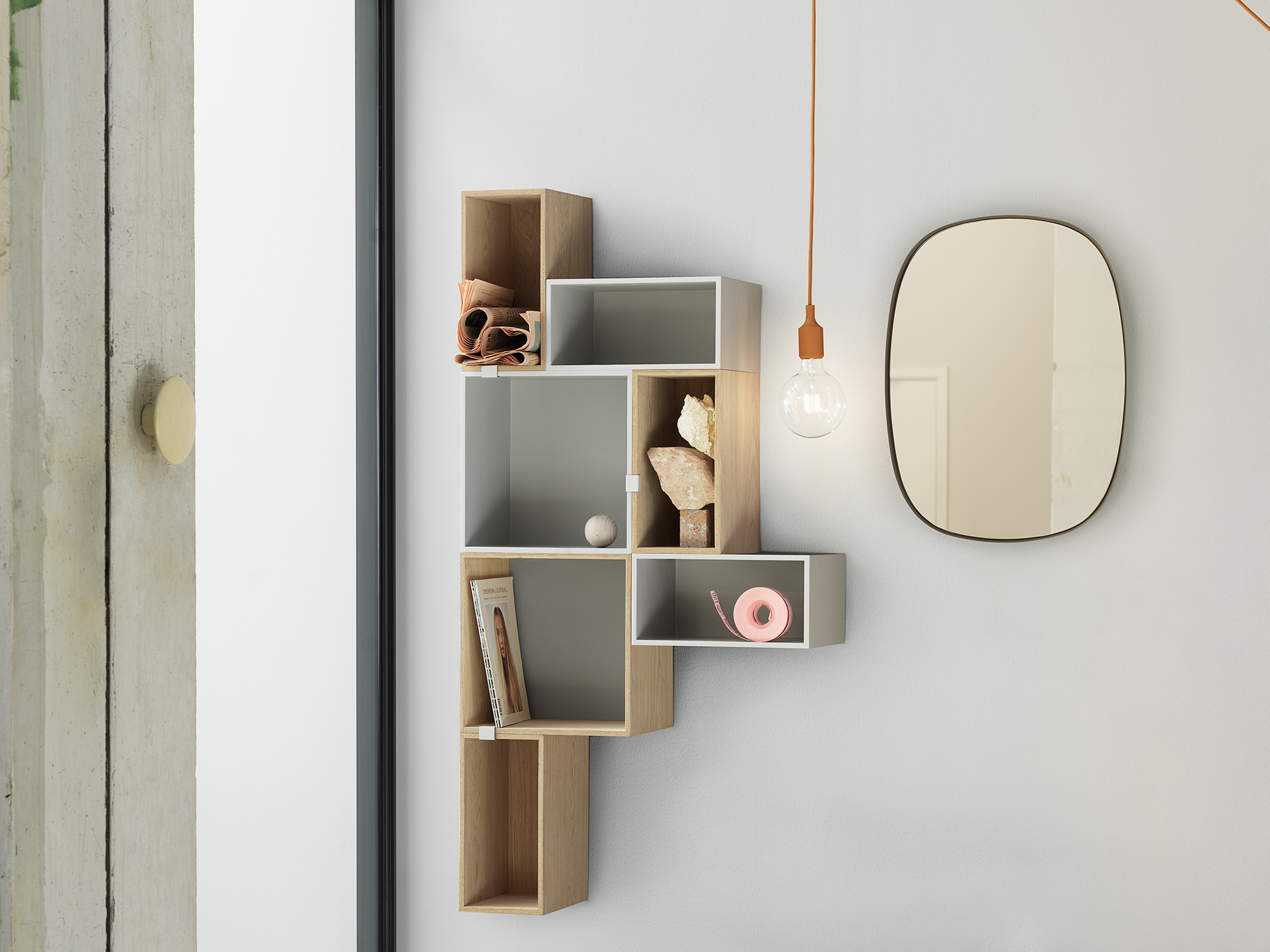 The Mini Stacked is a wall-hanging alternative to the Stacked Storage System with a lighter expression and smaller sizes, making the modules a perfect fit for smaller spaces such as kitchens, hallways, nightstands and bathrooms.