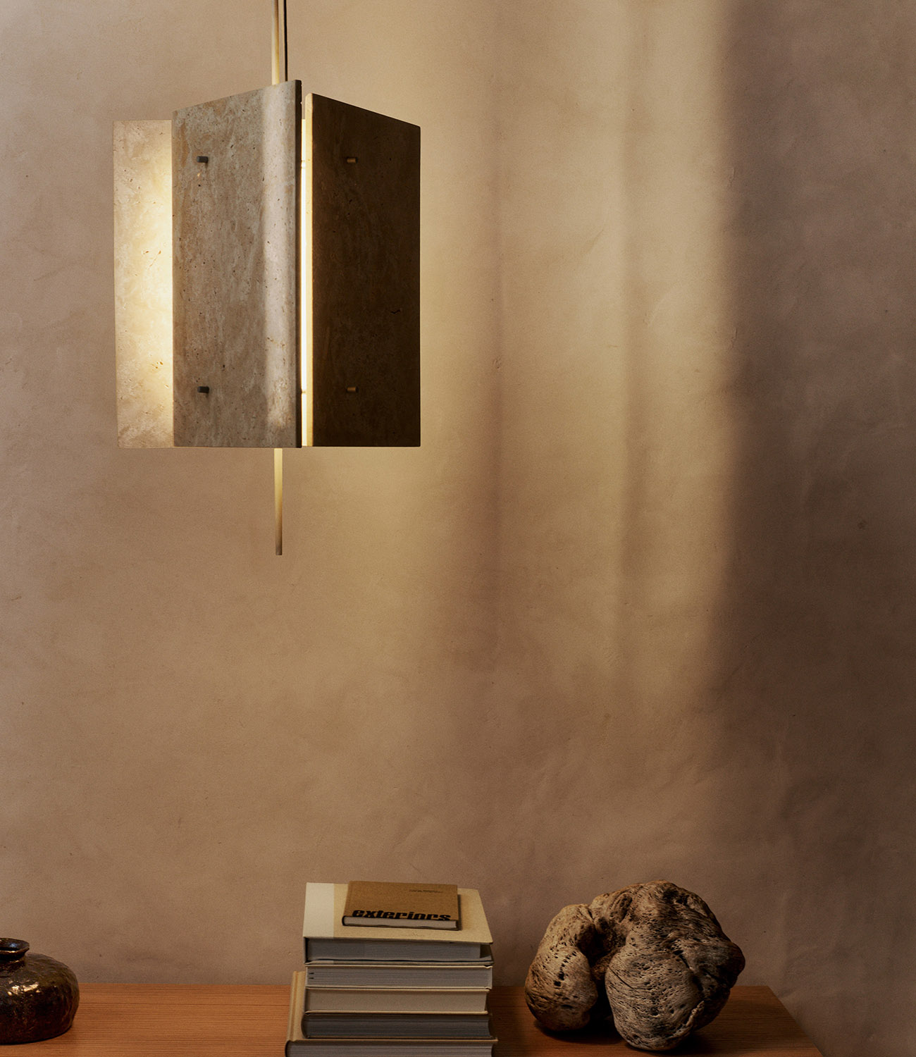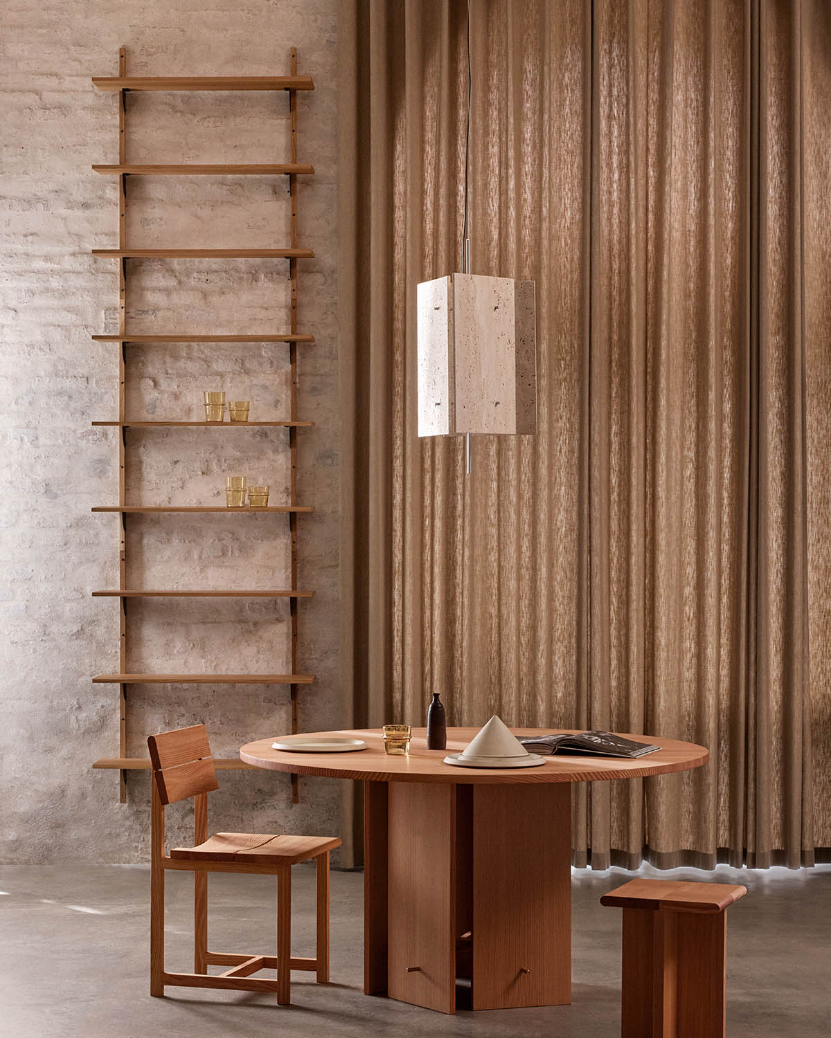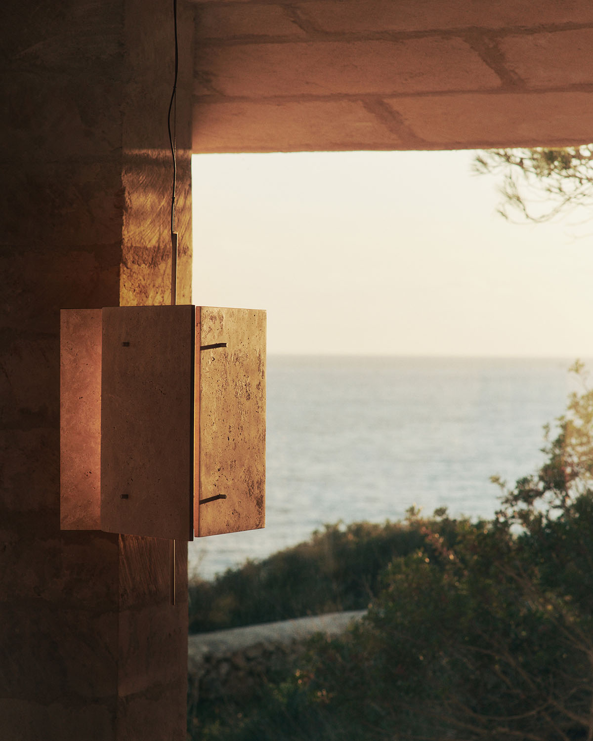 The Ferm Living x Utzon – Can Lis collaboration draws inspiration from architect Jørn Utzon’s family home in Mallorca, merging the natural environment with design elements that reflect his unique philosophy. The Oeste Pendant Lamp features three panels of travertine surrounding a central light source, creating a dynamic play of light and shadow. The natural texture of the stone enhances the warm, diffused light, casting a soft, architectural glow. Flat-packed for easy assembly, this design blends materiality with function and offers an atmospheric lighting solution for any space.