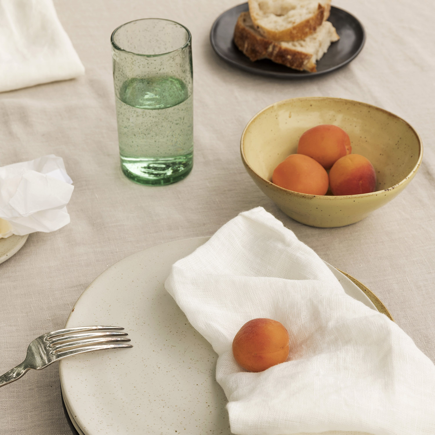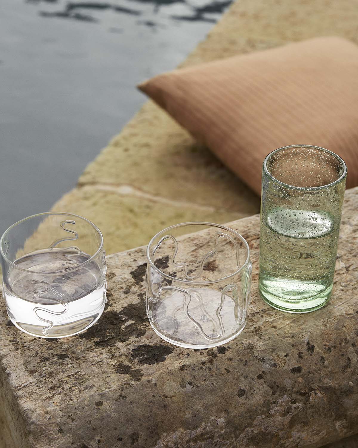 Effortlessly resting in your hand, the versatile Oli glassware is designed for everyday living. The glasses are made from 100% recycled glass with a characteristic, subtle tone that makes chilled beverages appear even more refreshing. Adding to their tactility, the Oli glassware has distinctive, tiny bubbles created by deliberate pockets of air left between the layers of mouth-blown glass. Each glass in the Oli collection is unique in thickness and colour, owing to the recycled material and the intricate process of blowing the melted glass into shape.