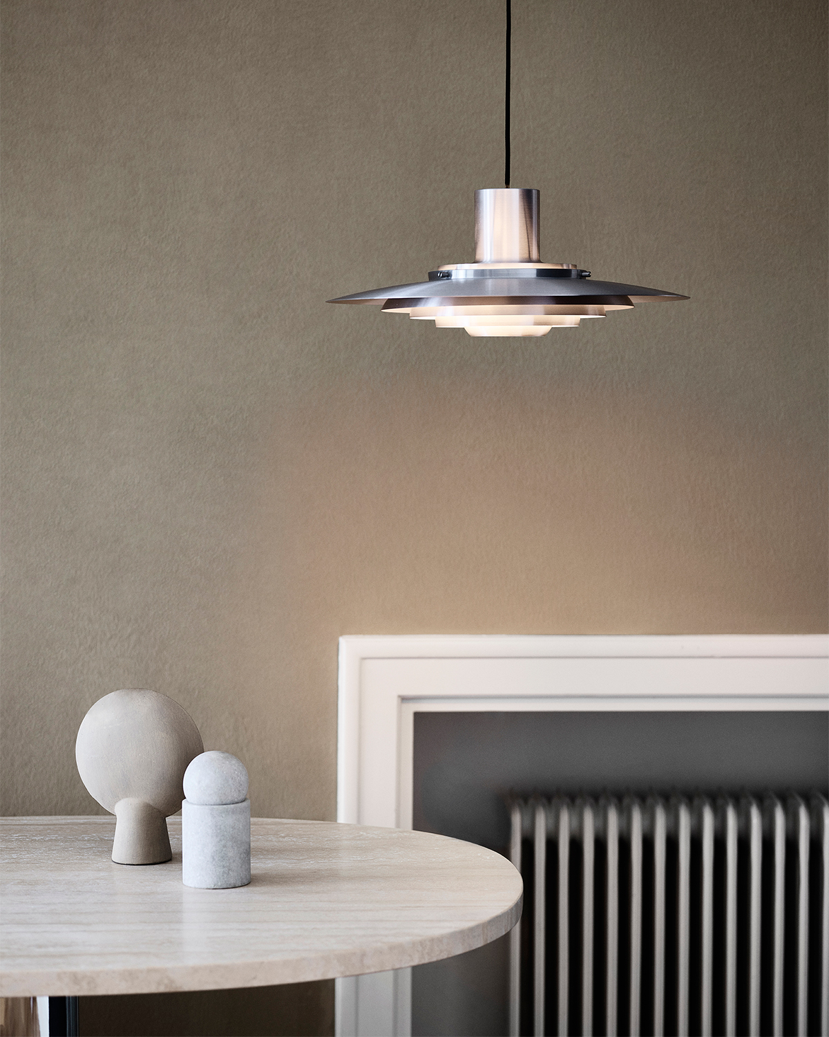 Jørgen Kastholm & Preben Juhl Fabricius were Danish architects whose work influenced the signature style of Danish Modernism. &Tradition’s relaunch of the P376 pendant lamp honours their original design from 1963. Comprising five concentric shades which gently curve towards the centre to emit a soft, diffused light, the lamp is available in either aluminium or aluminium with a white lacquer underside and in two sizes; KF1 has a diameter of 47.5cm and KF2 of 70 cm.