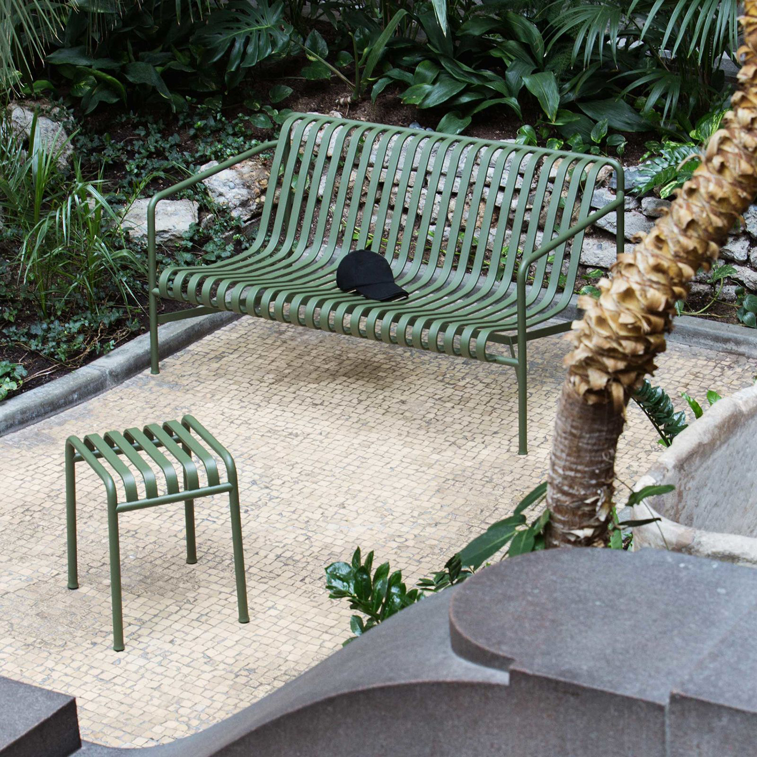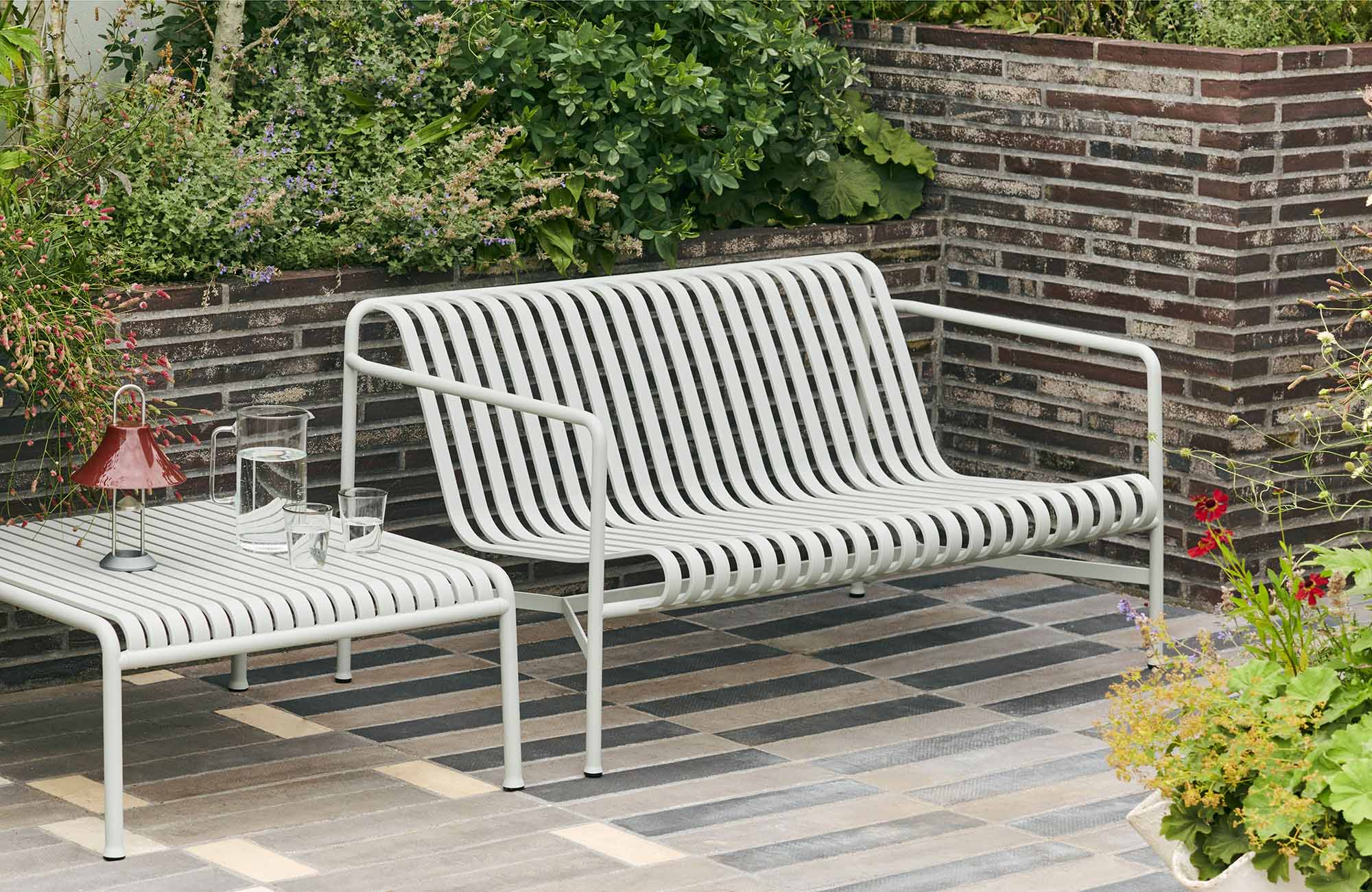 Palissade is a collection of outdoor furniture designed by Ronan and Erwan Bouroullec for HAY. The collection was designed to fit a wide variety of environments: cafés, restaurants, gardens, terraces and balconies. The construction allows a wide range of typologies with a common formal language. From stools and benches to chairs and tables, lounge chairs and sofas – the collection comprises 13 different elements, united not only by their graphical image but also by their common characteristics: they are strong without being bulky, elegant without being fragile.