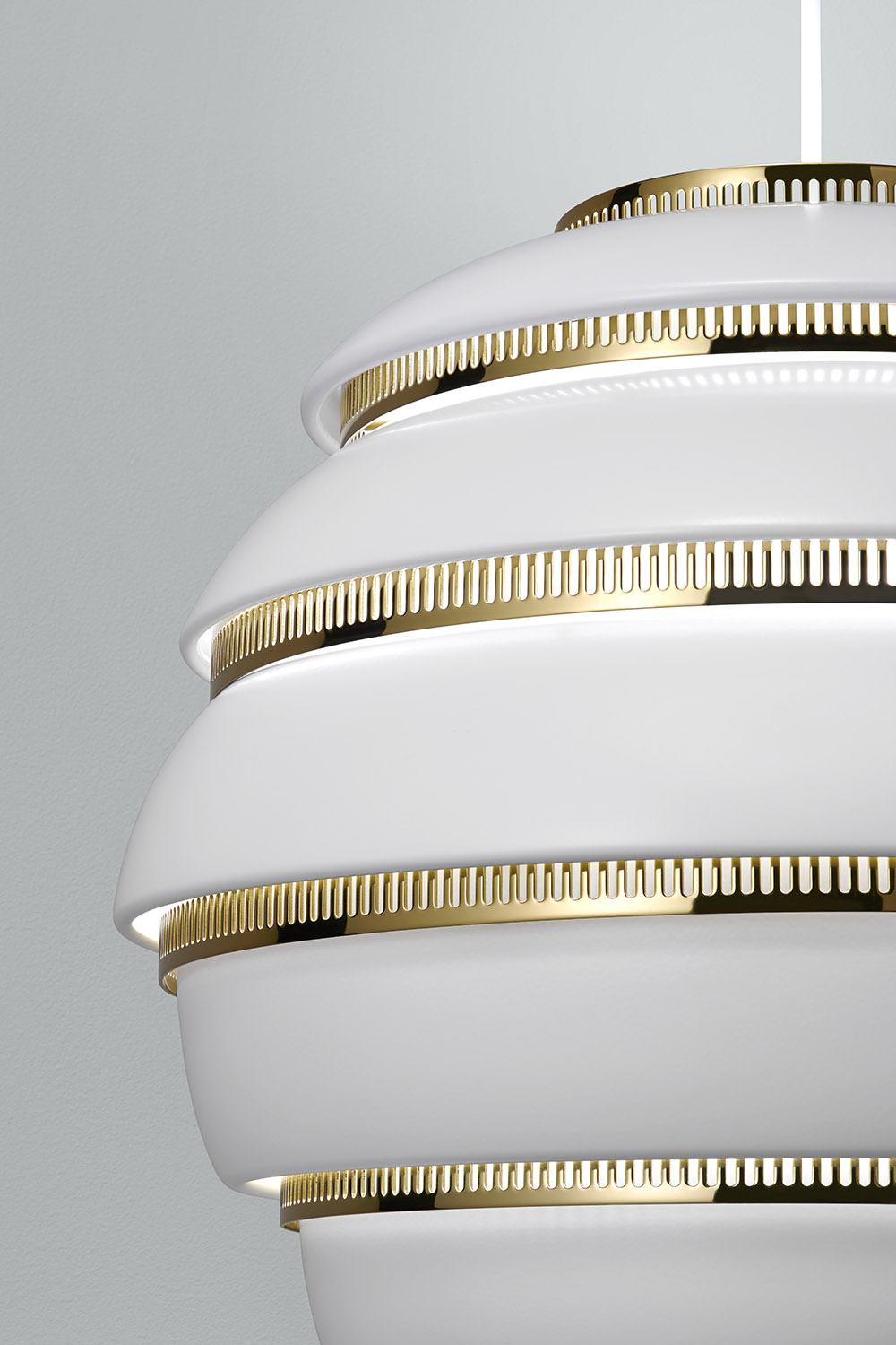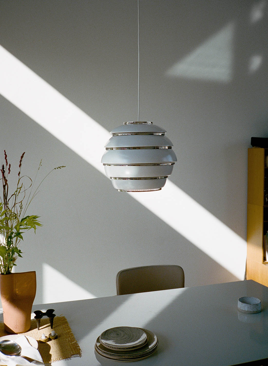 The A331, nicknamed “Beehive,” is one of Alvar Aalto’s most popular lighting designs. Suitable for homes and public spaces alike, “Beehive” creates a warm, diffuse light when switched on, a result of the ingenious design that features several rows of perforated steel rings. True to its nickname, “Beehive” retains its distinctive sculptural presence even when unlit and was originally designed for Finland’s University of Jyväskylä in 1953.