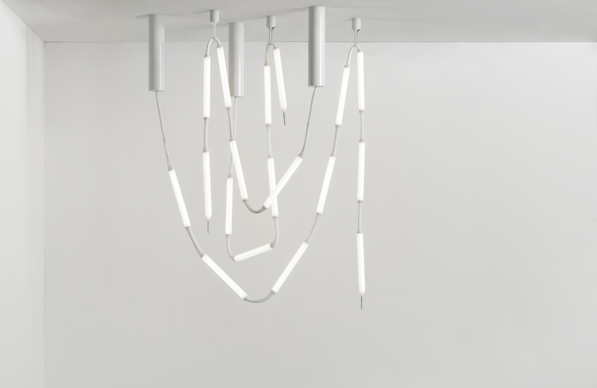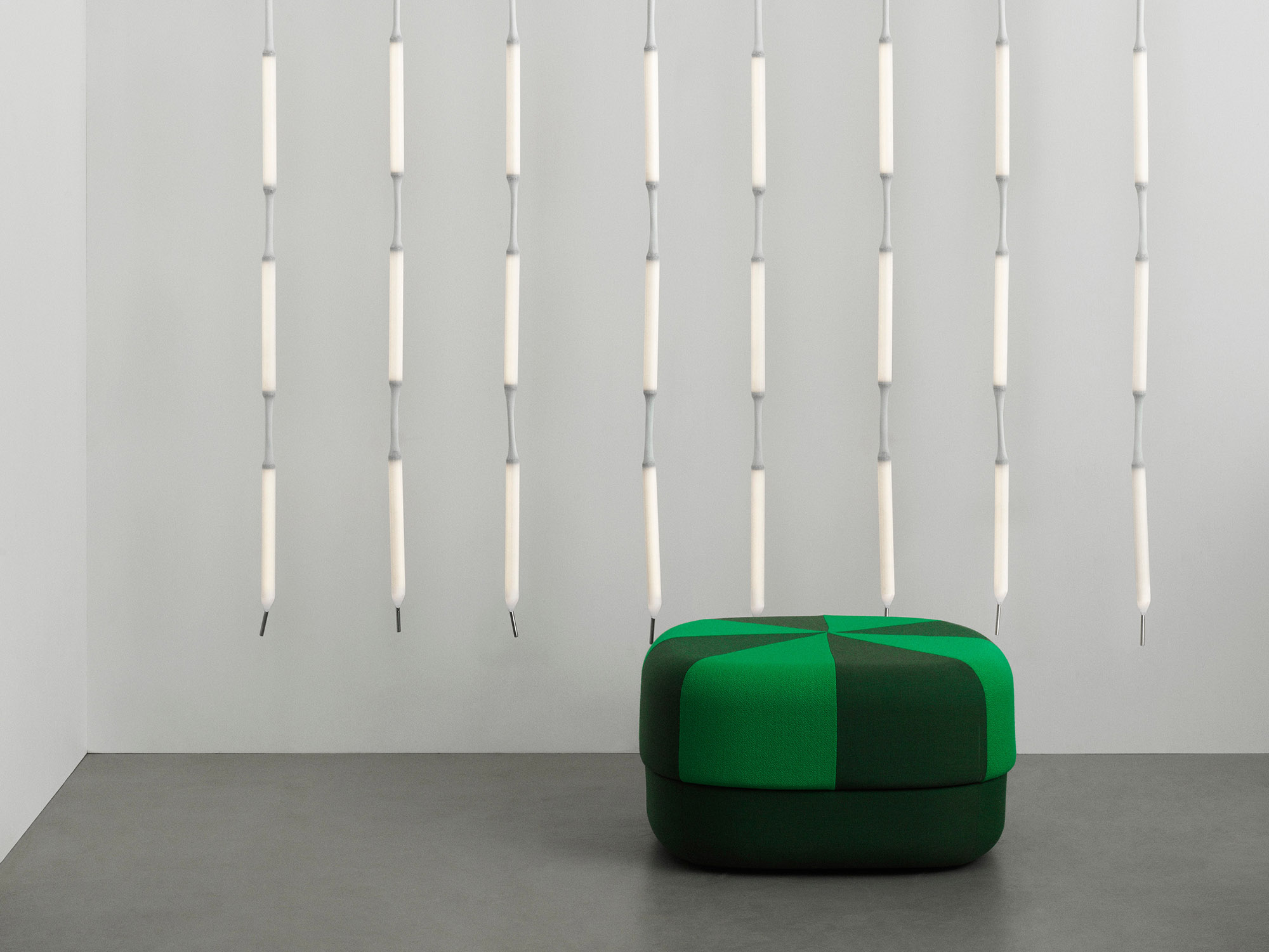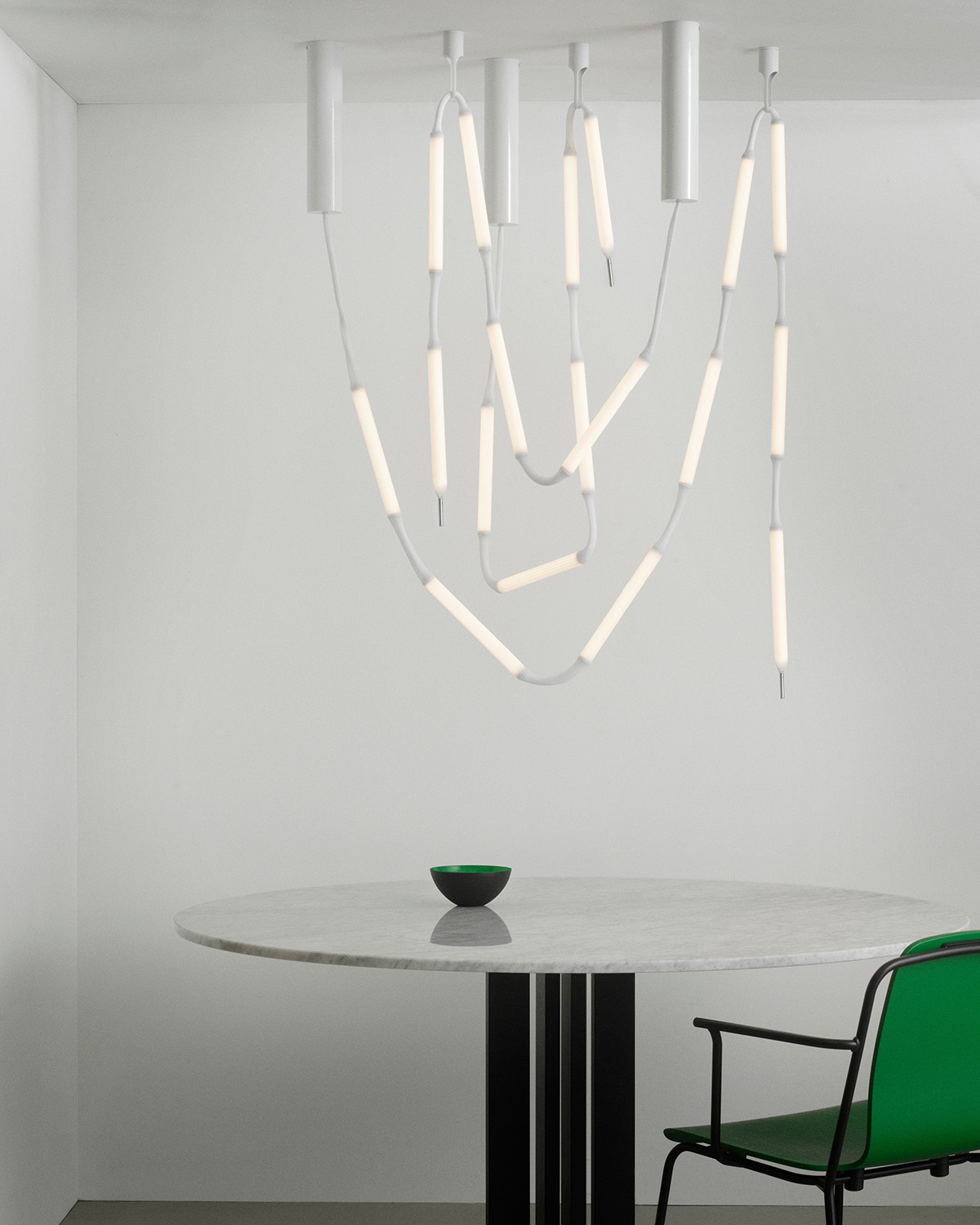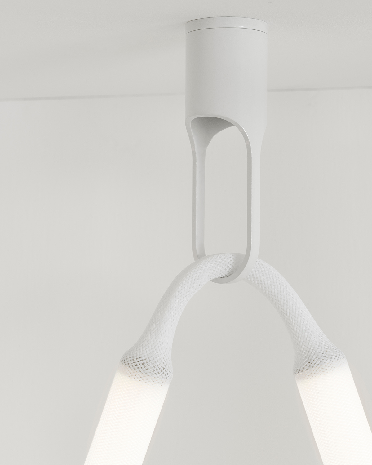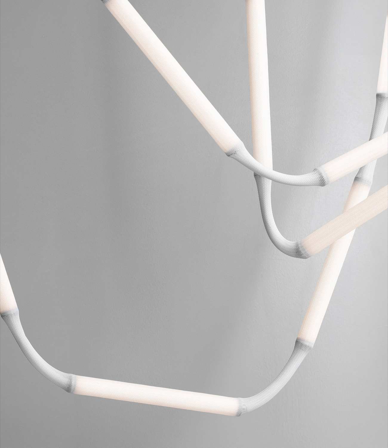 Reb Lamp is a sculptural and versatile pendant light designed by German designer Verena Hennig of AKTTEM. Known for her human-centered and innovative approach to design, Hennig brings her tactile, playful and functional aesthetic to this distinctive lighting concept. The Reb Lamp reimagines the boundaries of pendant lighting design with either five or eight lighting modules encased in delicate mesh fabric. Designed for flexible configuration, Reb encourages users to creatively craft bespoke arrangements that adapt to any spatial setting and lighting need. Whether used as a cascading curtain of light, an abstract chandelier, or a minimalist room divider, Reb Lamp invites personal expression and creative exploration.