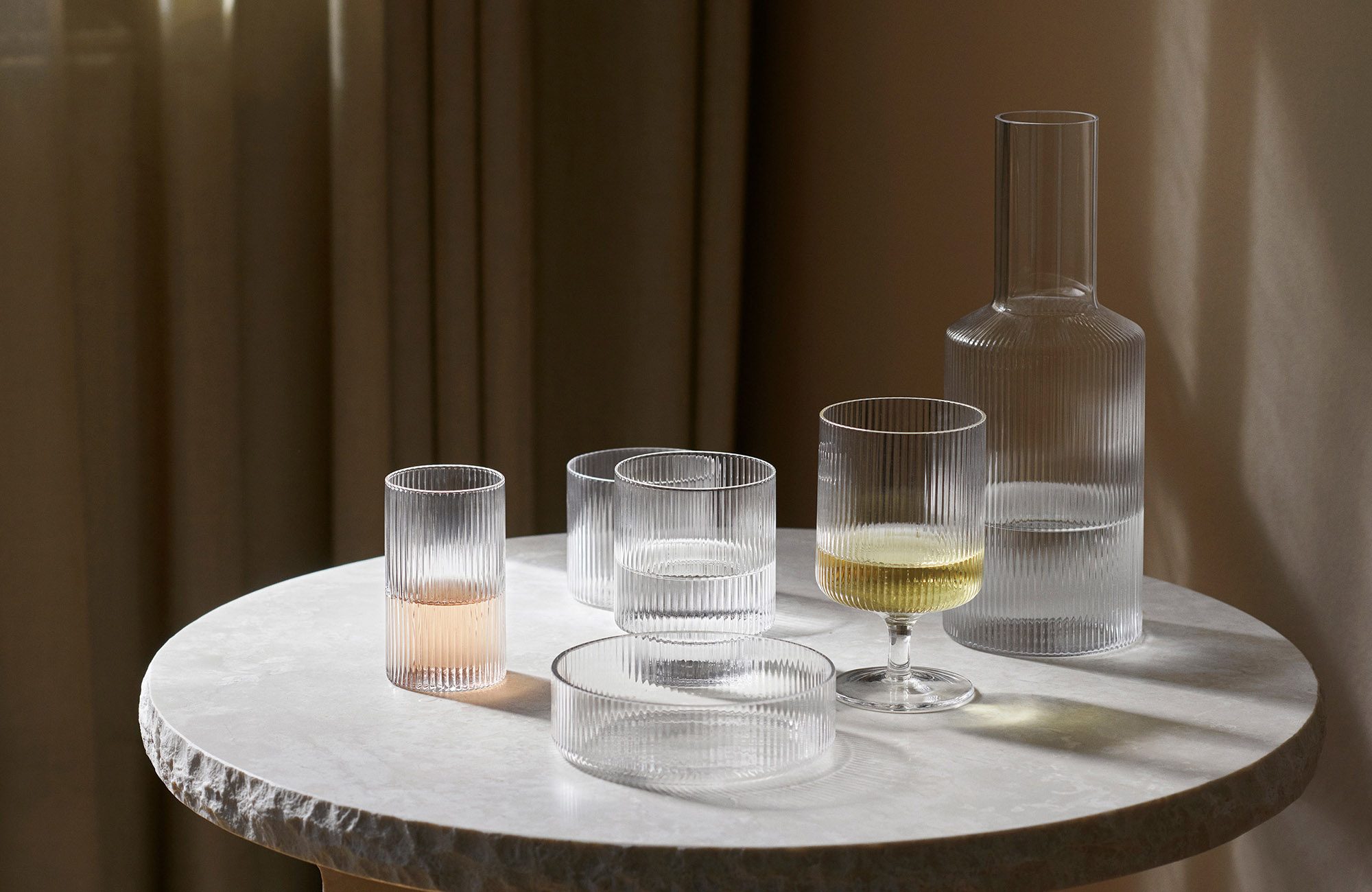 Made as a small version of the original Ripple drinking glasses, this set of four tumblers is an elegant new member of your table setting. They are mouth-blown, and each of the four features the distinctive use of geometric levels that characterise the series. Use them for your favourite liqueur, condiments or maybe even as an egg cup.