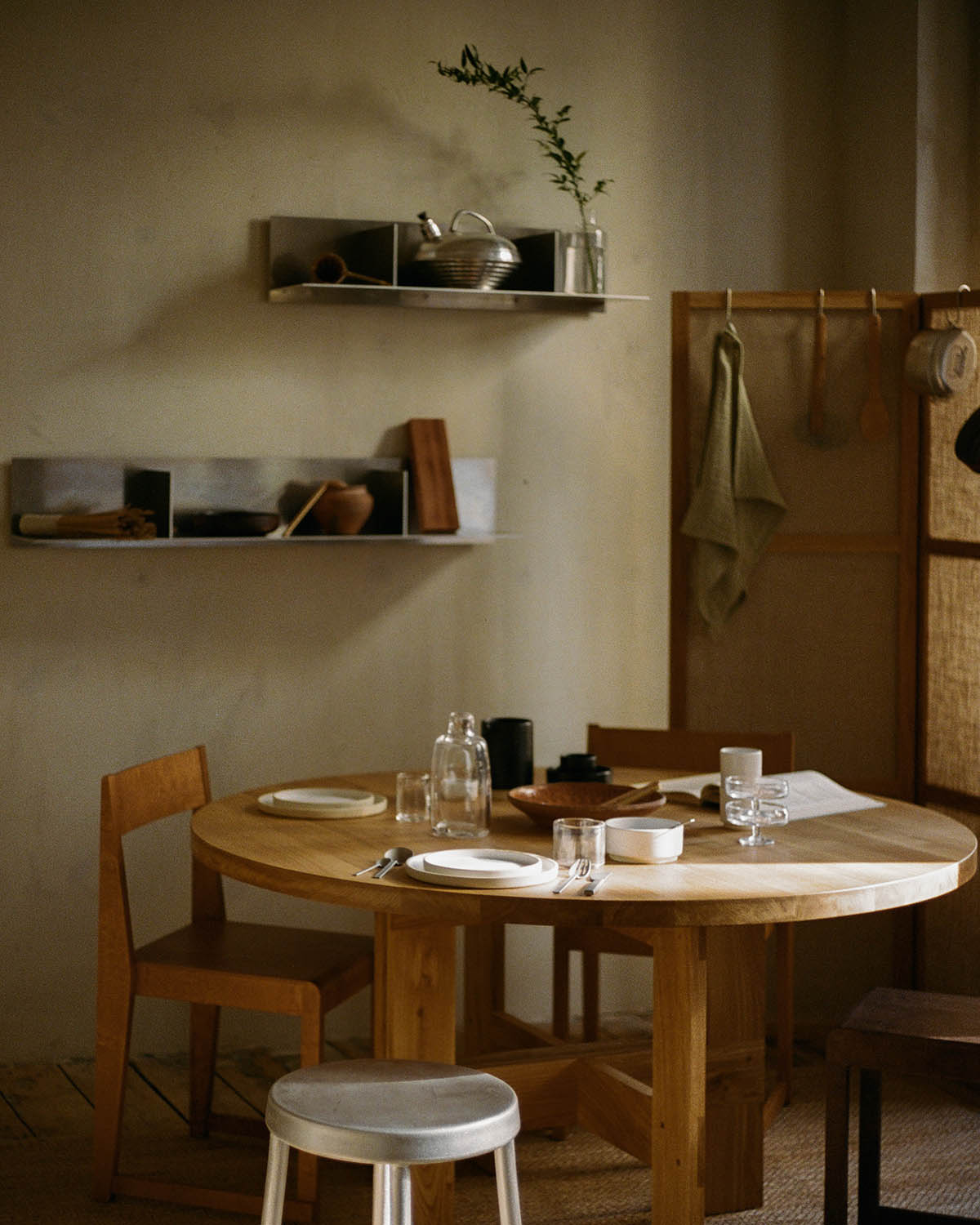 The Rivet Shelf explores basic storing facets within one shape while functioning as a storage and display platform. Based on a riveting technique suitable for making perpendicular joints between separate, laser-cut raw aluminum sheets, the shelf is put together by hand using a hammer in a cold-forming assembly process developed by designer Jonas Trampedach in 2011.