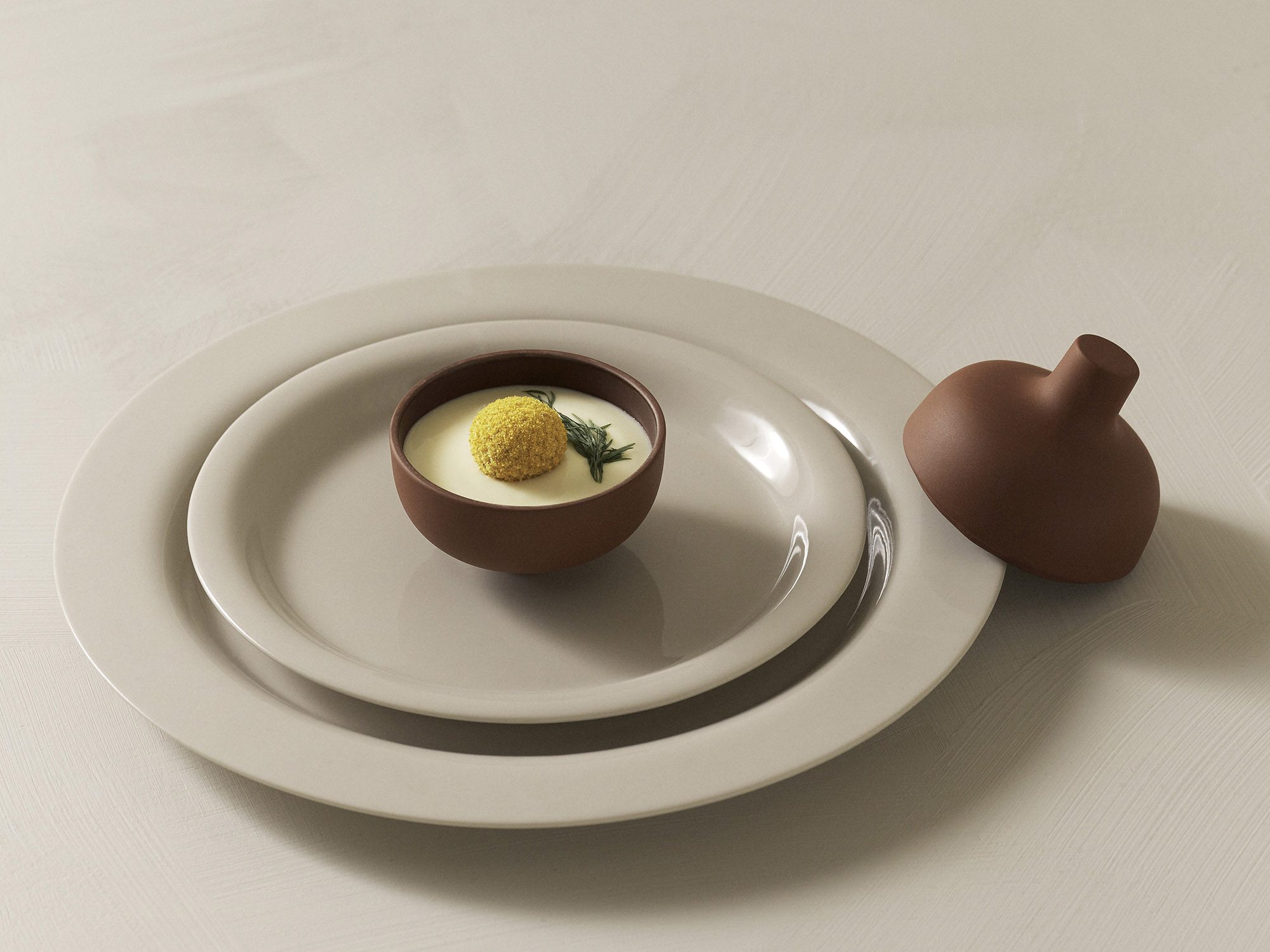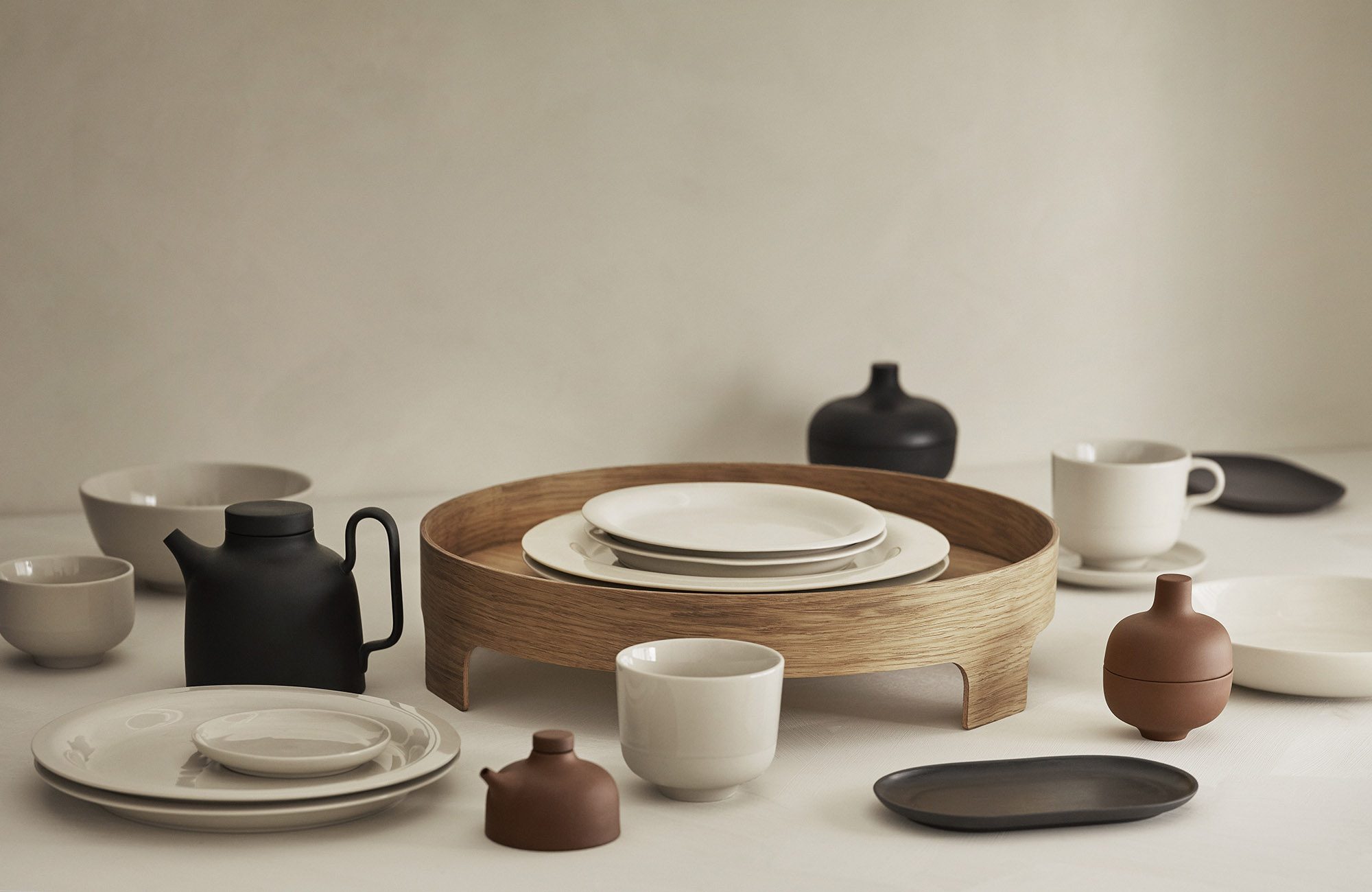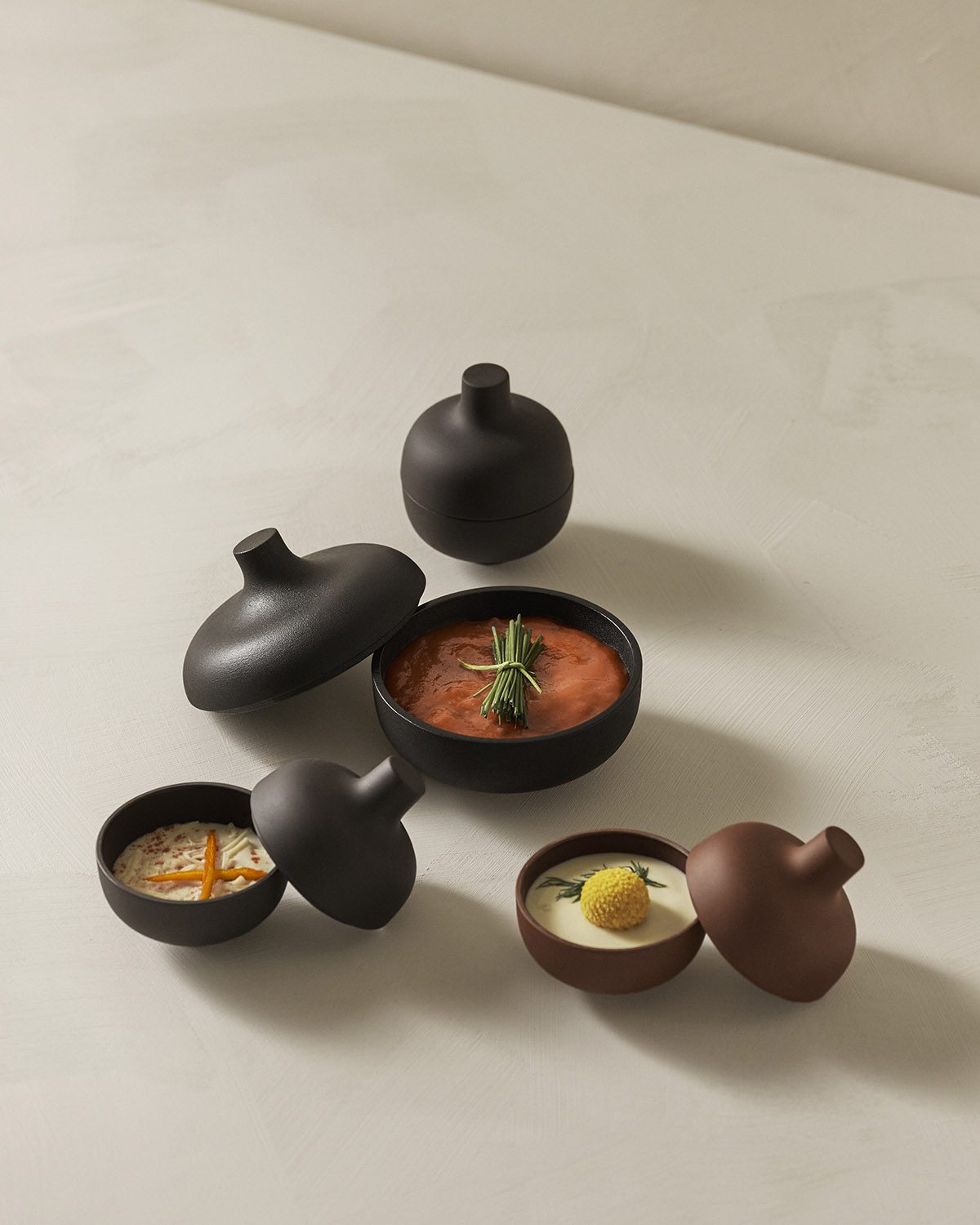 Carina Seth Andersson has once again managed to balance perfection and particularity in her new additions to Sand, her series of stoneware originally conceived for Nationalmuseum in Stockholm. The different objects are abstract yet familiar, alluding to age-old traditions refined to perfection. ‘There is a moment of surprise when you lift the lid,’ says Carina Seth Andersson. ‘The secrets of the chef unveiled! Together these earthenware objects will create a whole little landscape on the table.’ The trend to bring forward a multitude of different dishes for the table certainly does require the stage be set with a variety of vessels. Glazed on the inside, raw but softly polished on the exterior, the three black and clay-colored earthenware canisters are available in three different sizes.