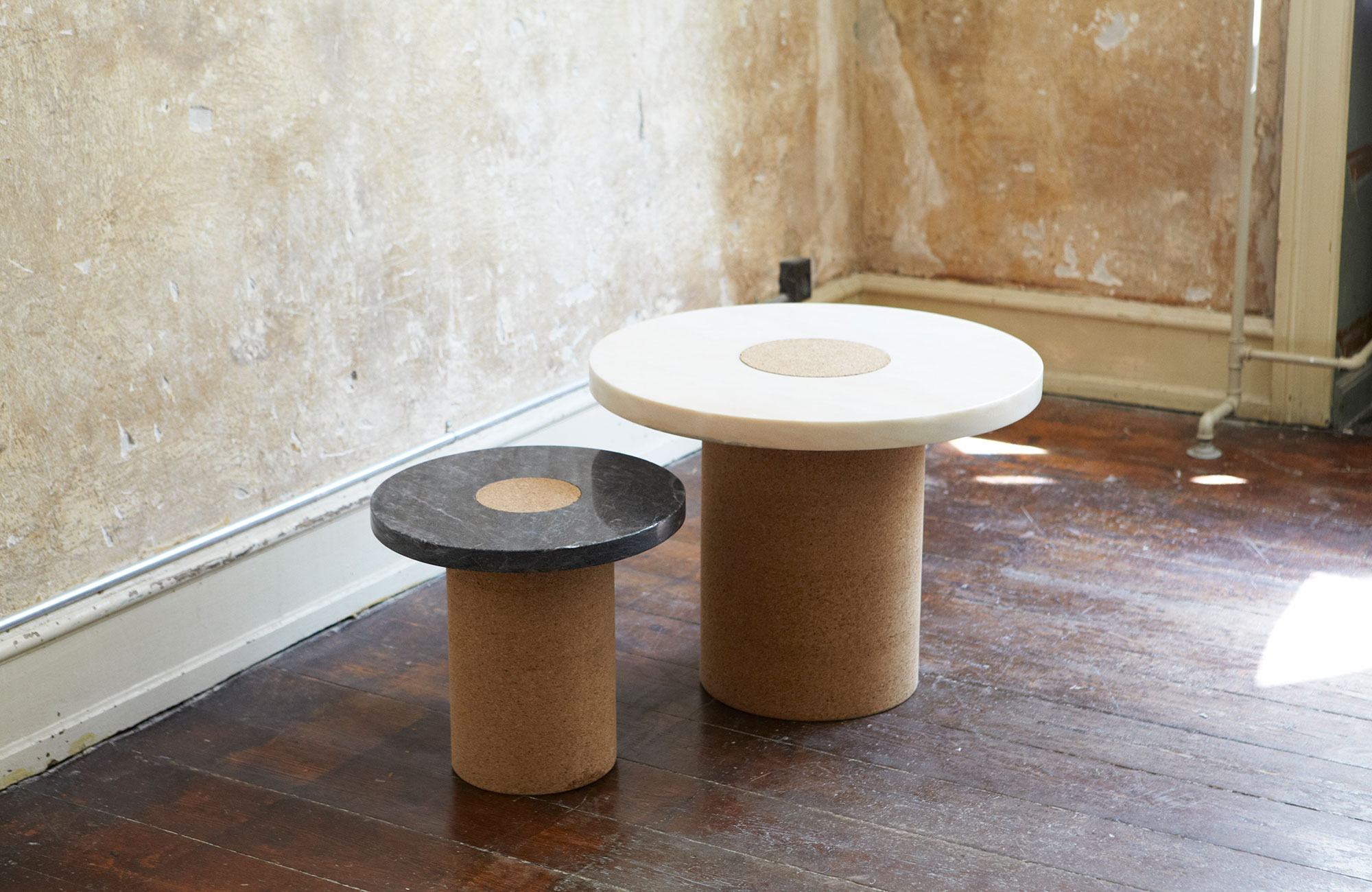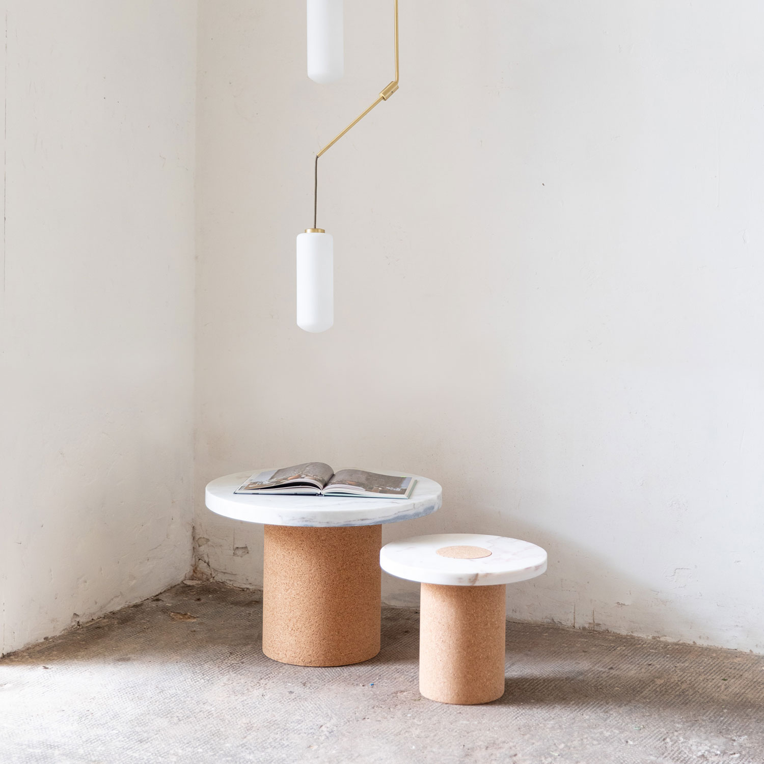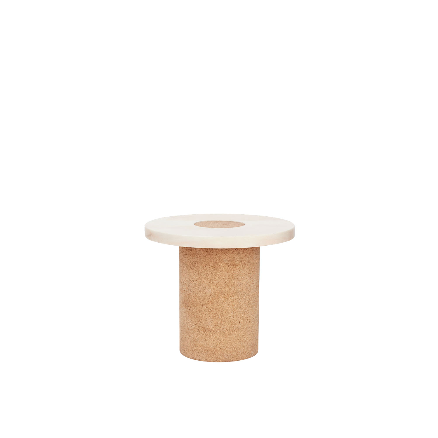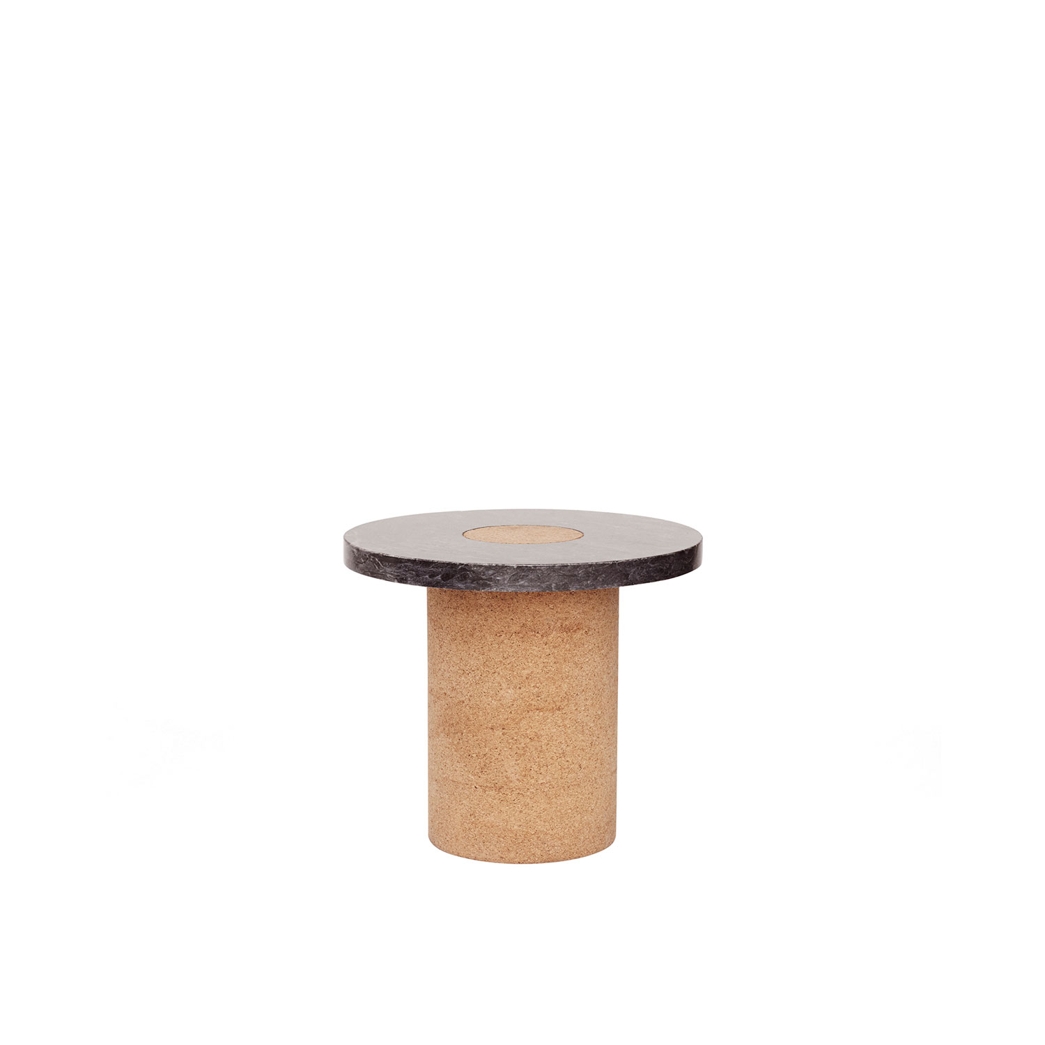 Suitable as a coffee table or side table where the contrast between the soft warm cork, meets the cold smooth marble. The distinction between the two shapes gives the impression of two worlds meeting one another.