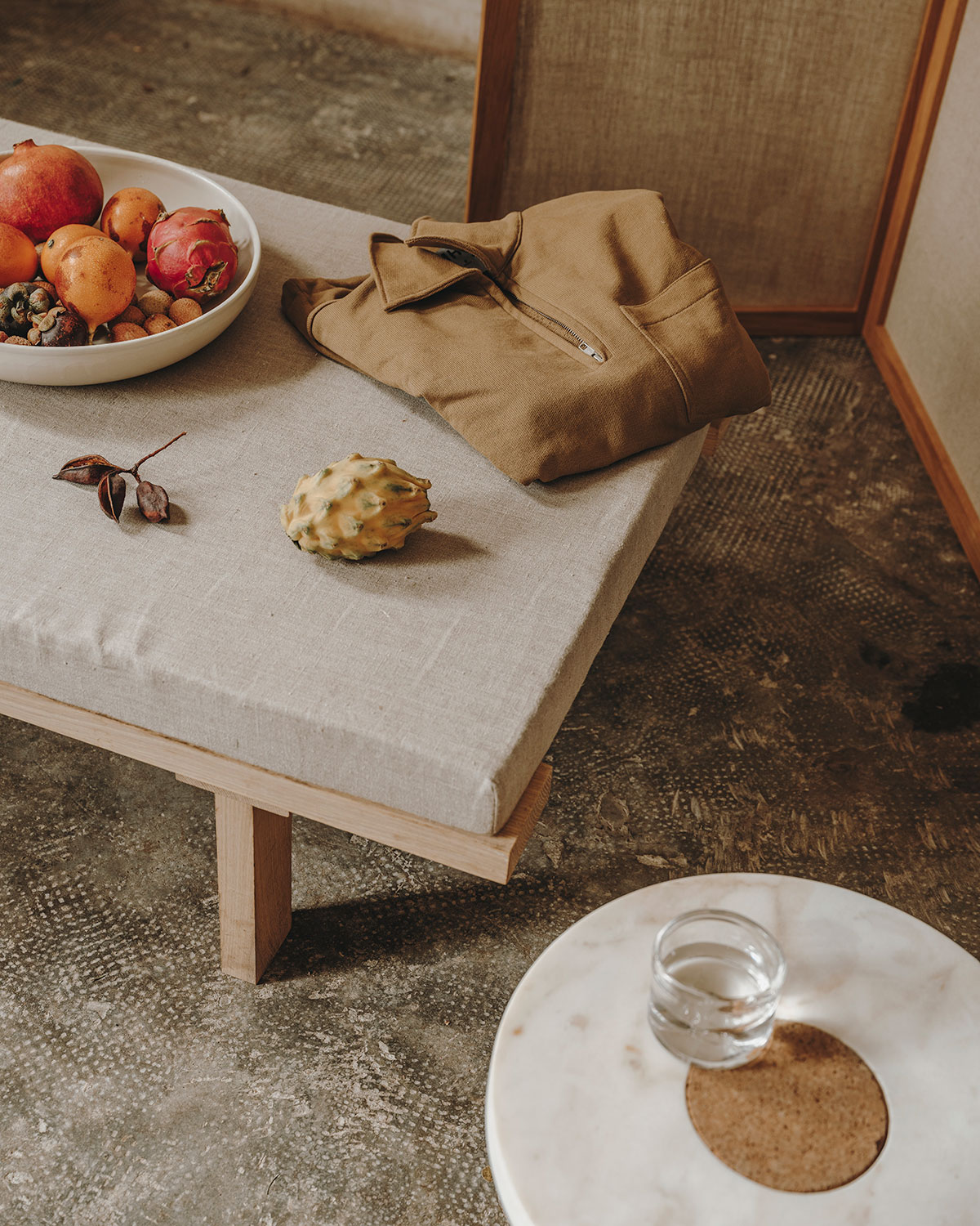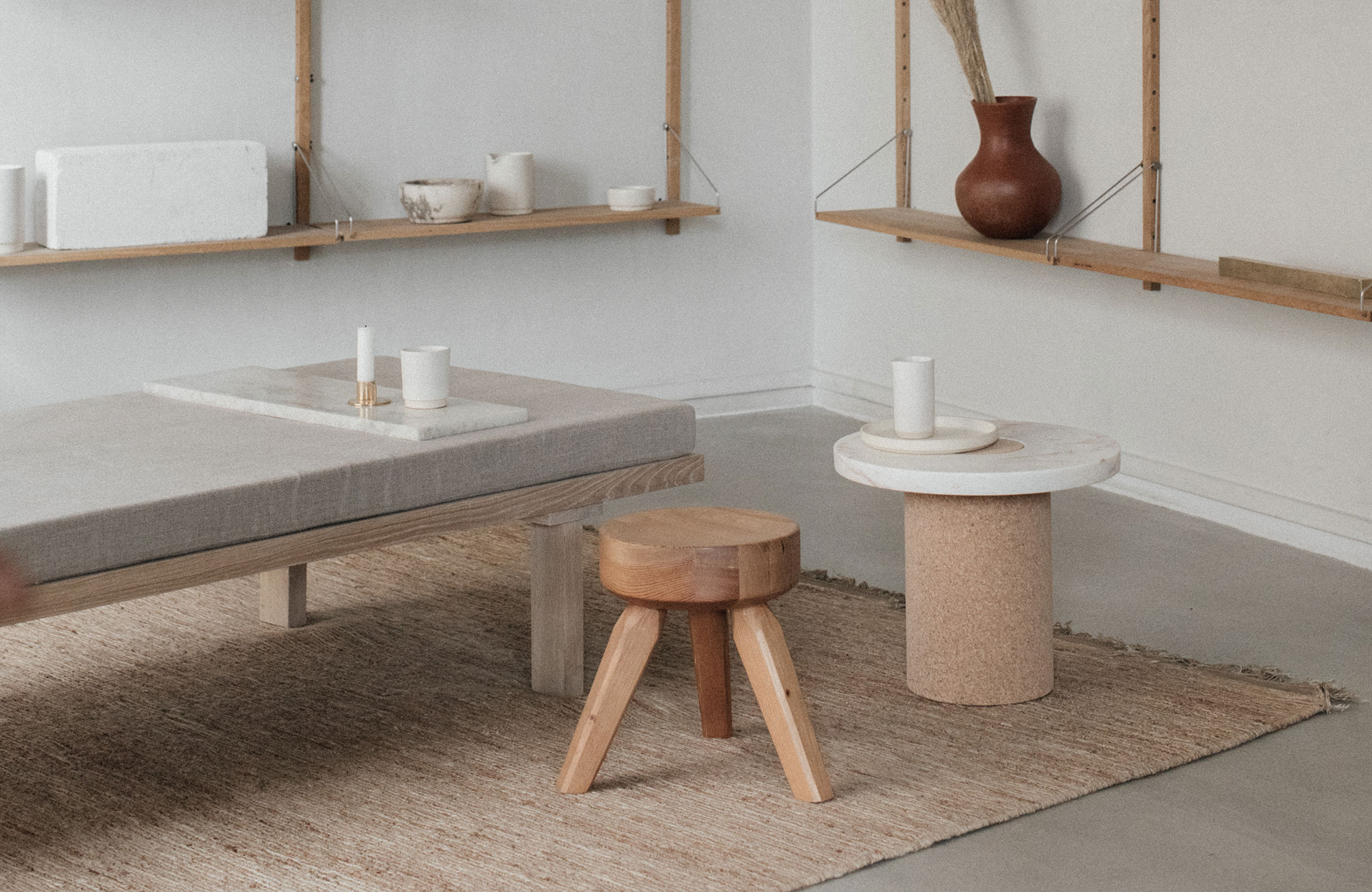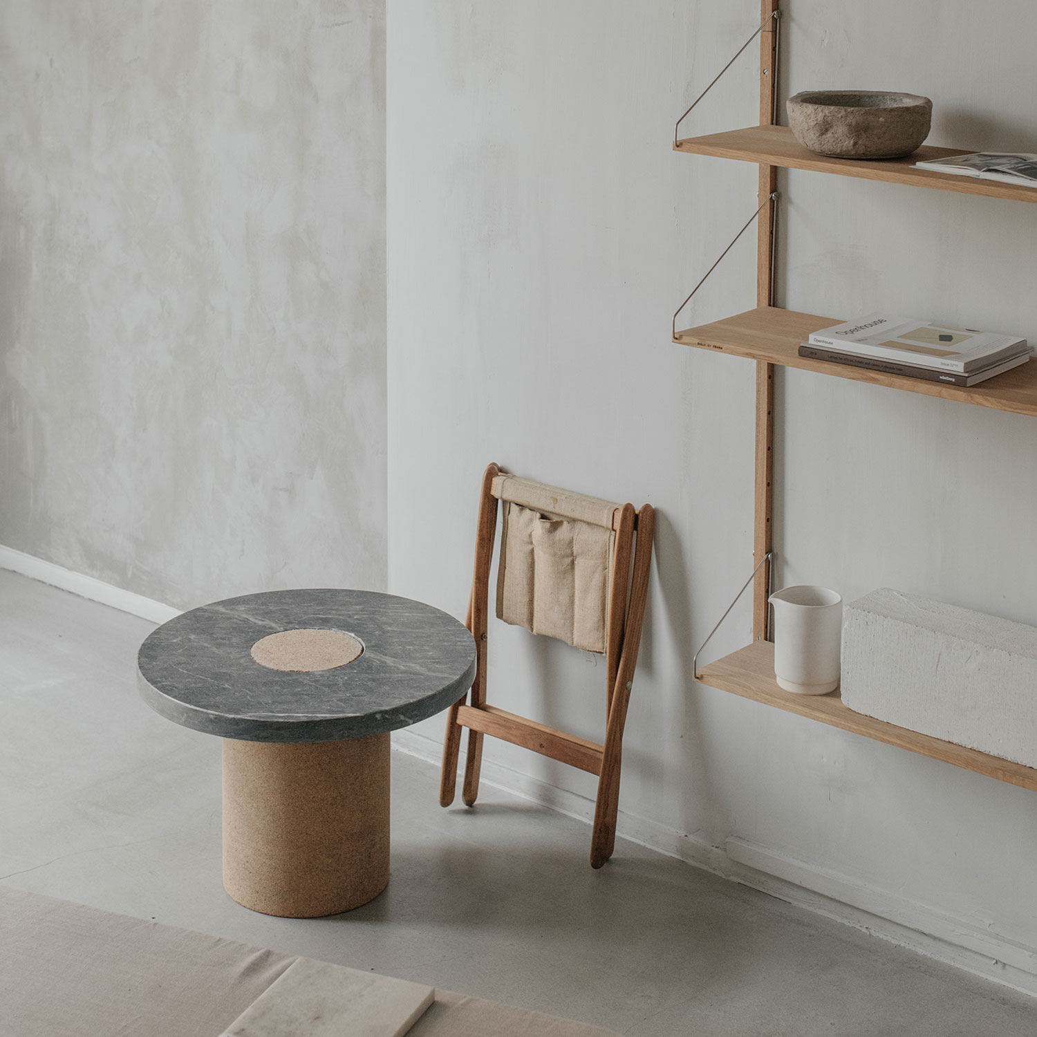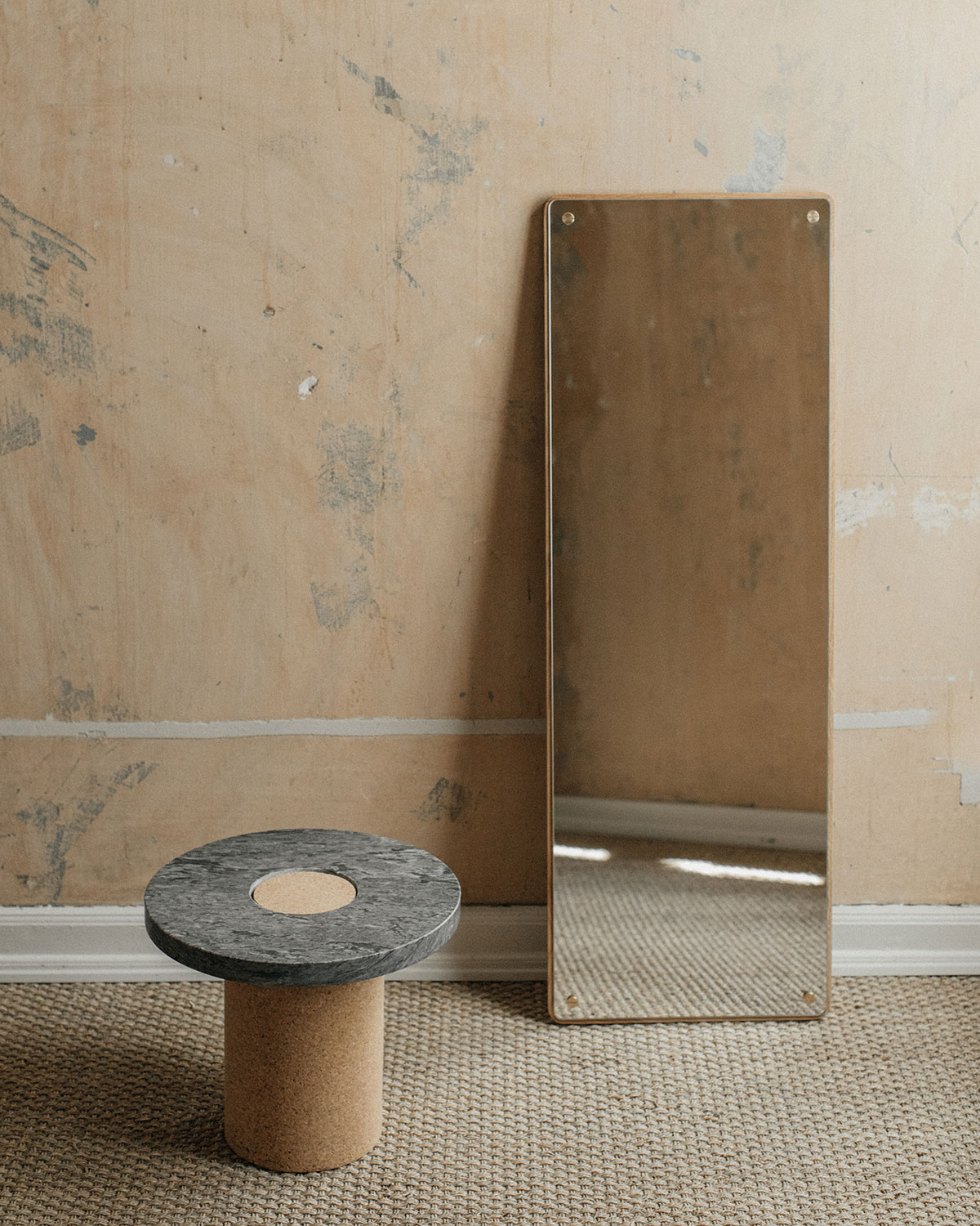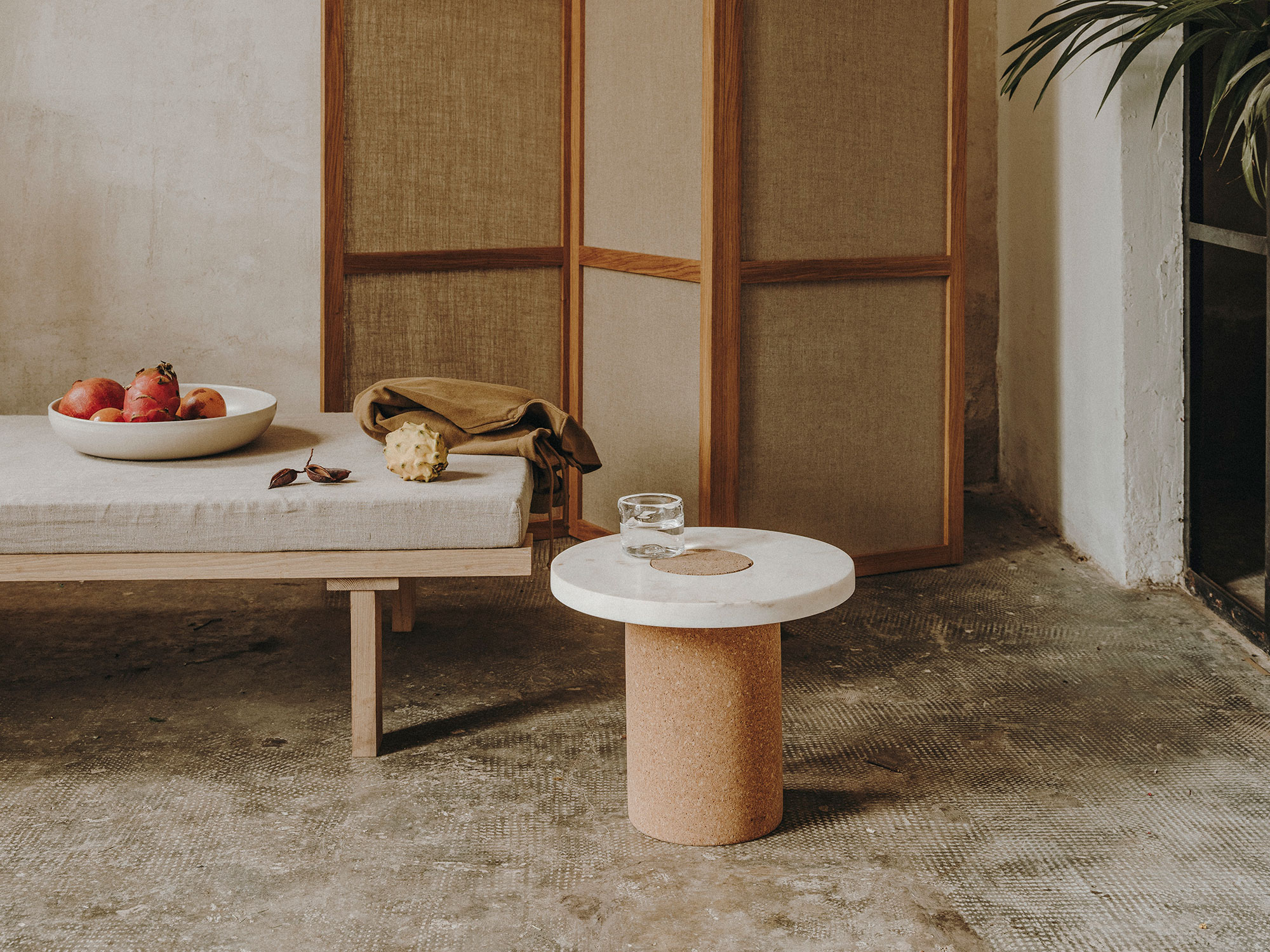 Suitable as a coffee table or side table where the contrast between the soft warm cork, meets the cold smooth marble. The distinction between the two shapes gives the impression of two worlds meeting one another.