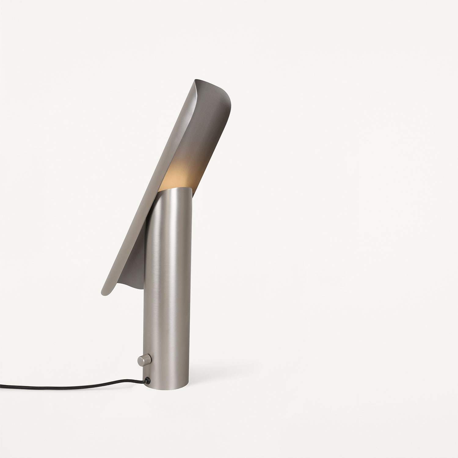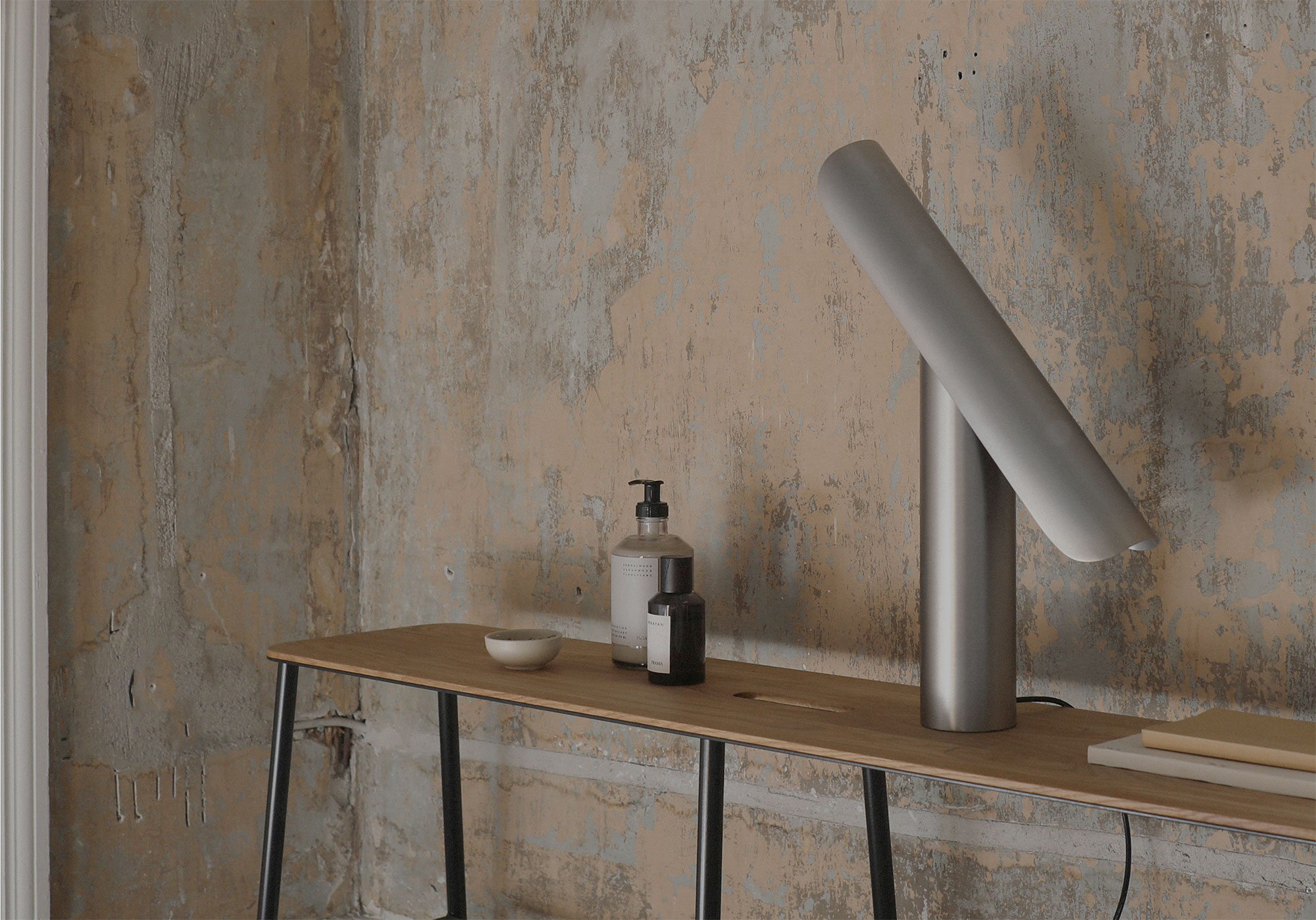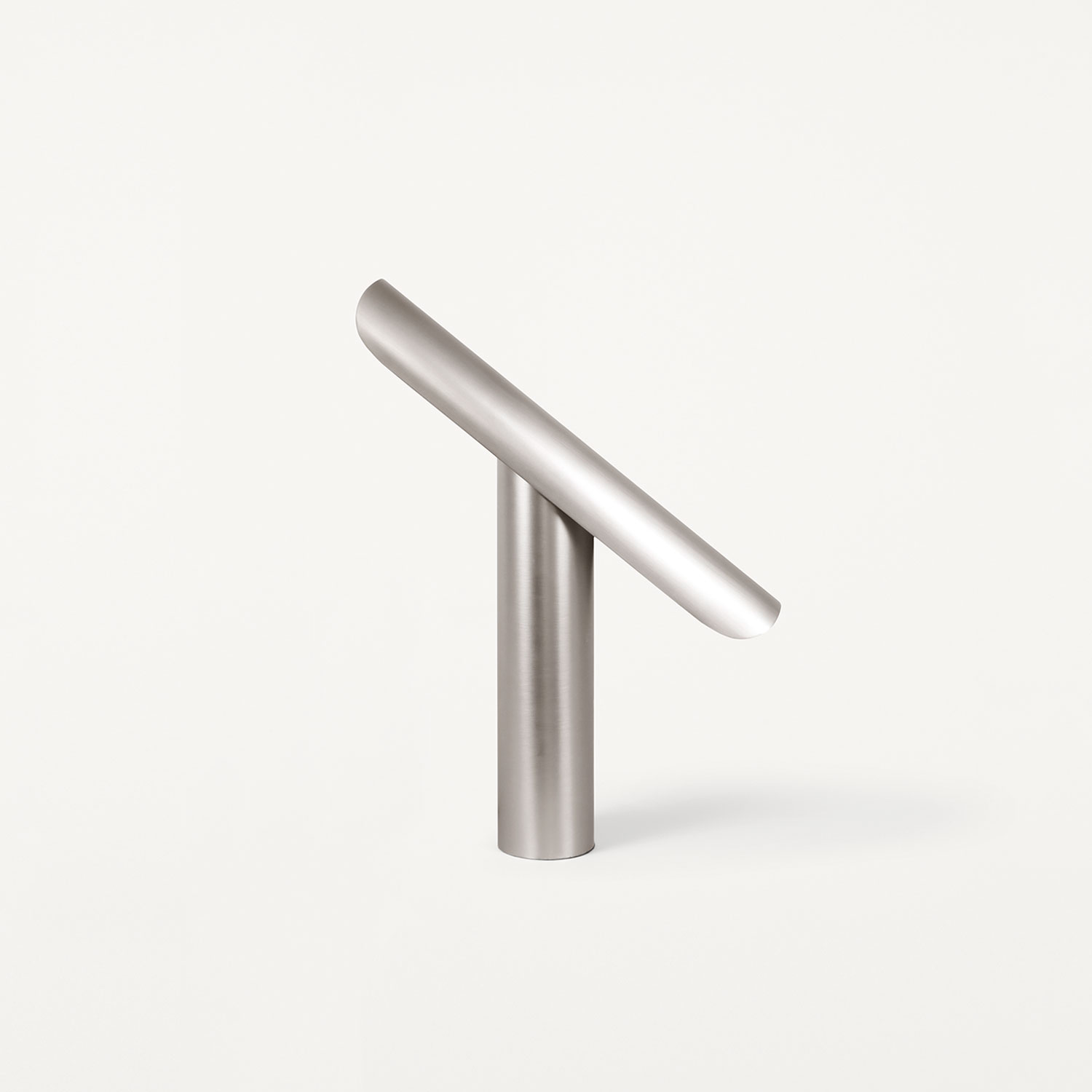 The T-lamp is a take on the archetypal desk lamp, with a simple mechanism allowing it to tilt and cast light from different angles. Although simplified to basic geometrical shapes, the lamp has a monumental appearance.