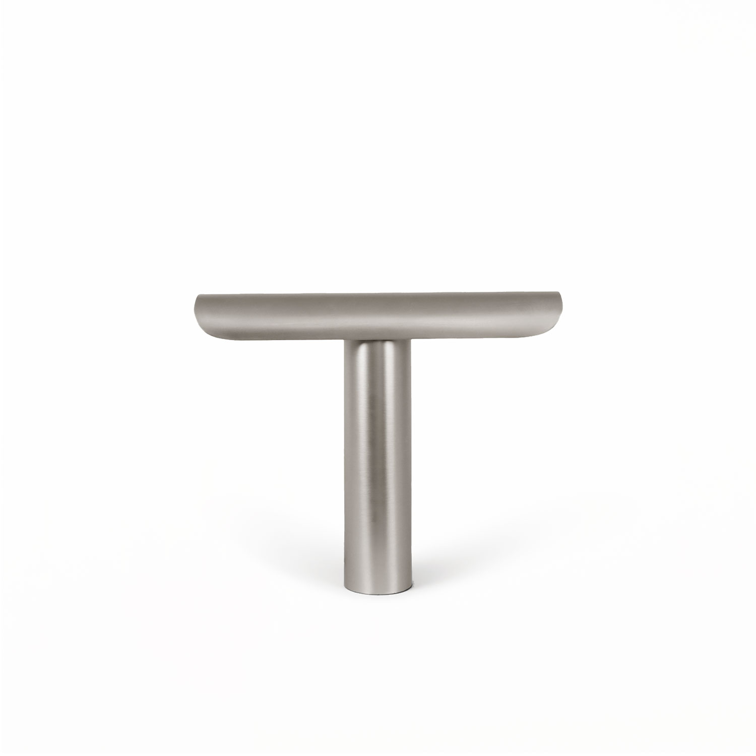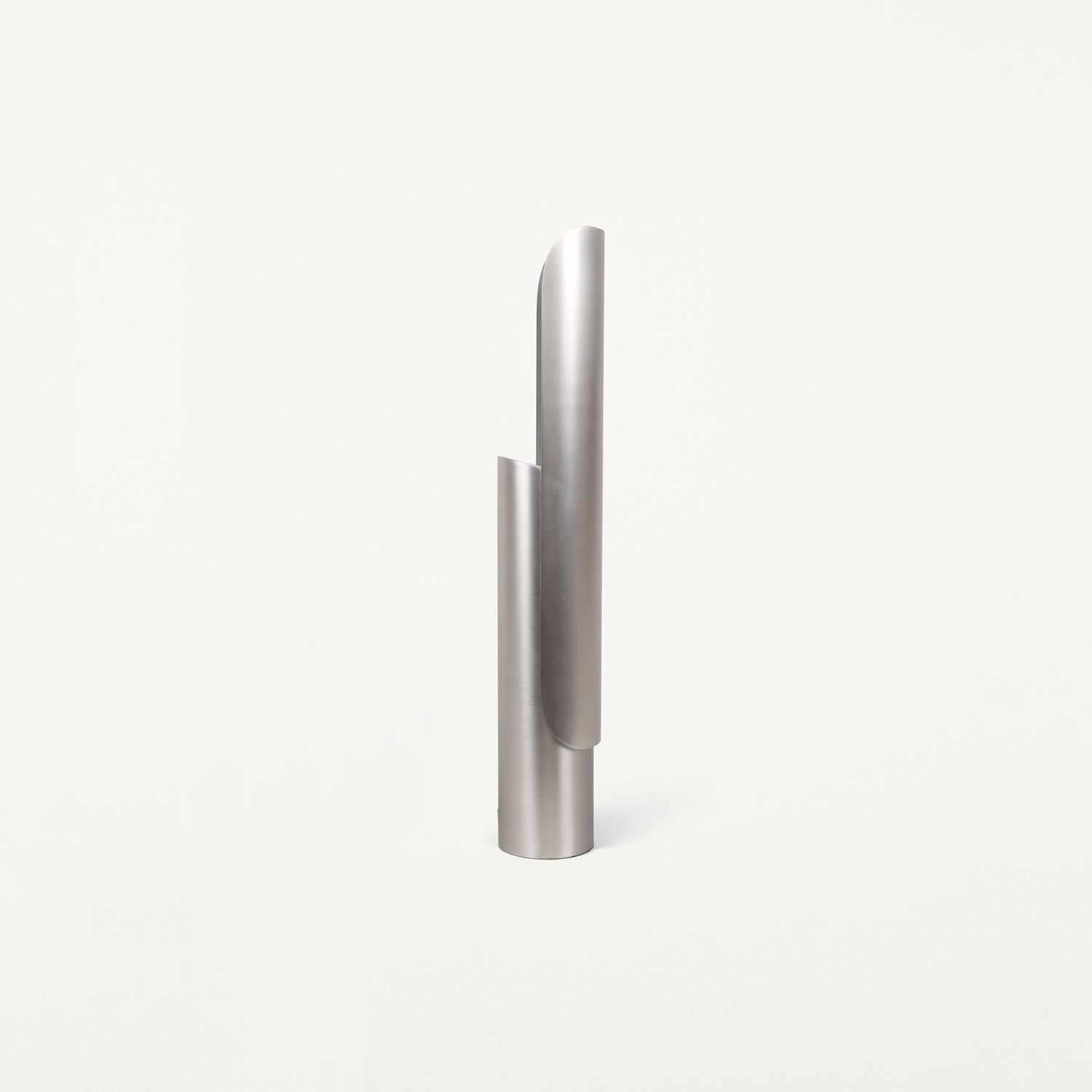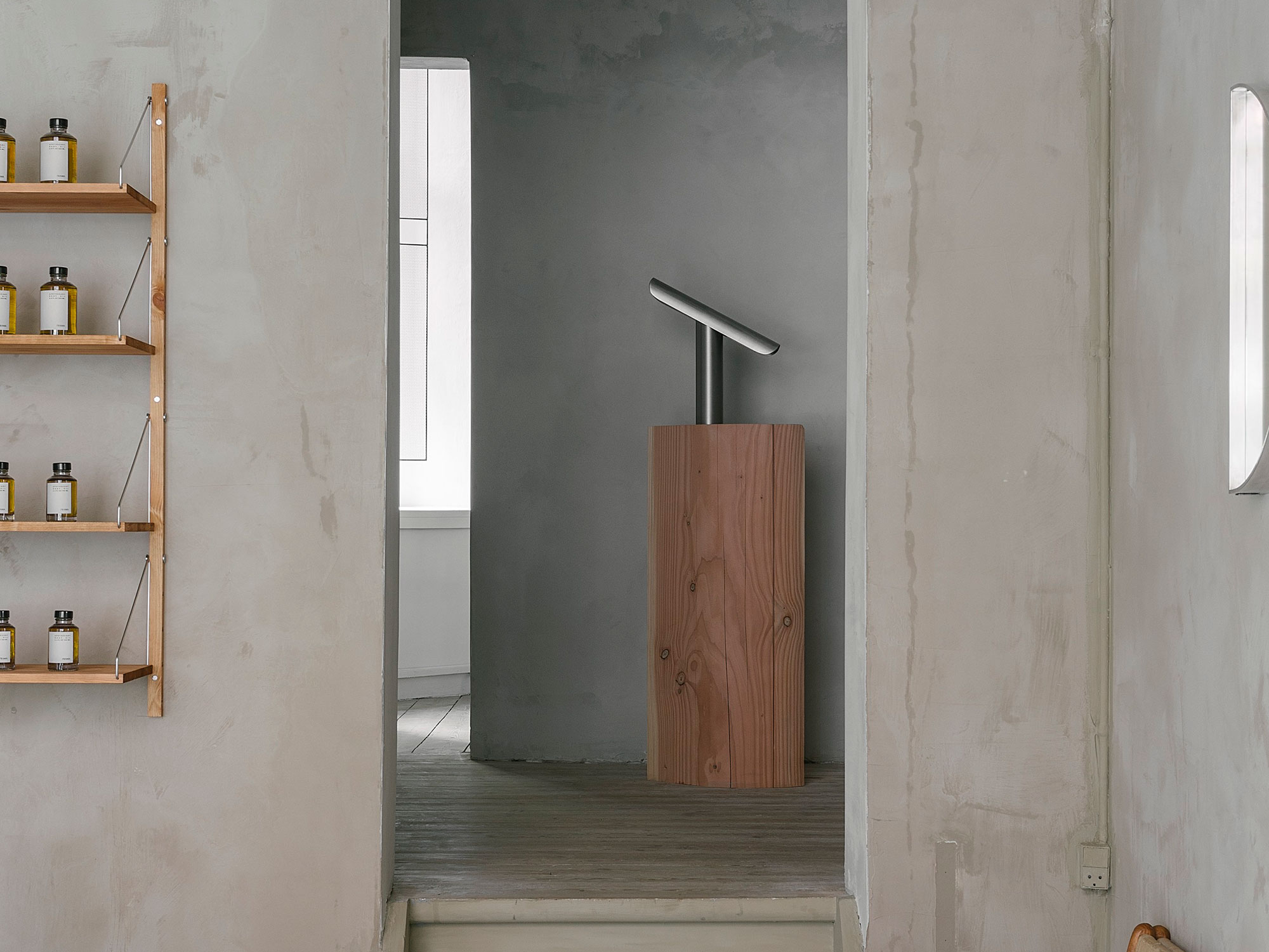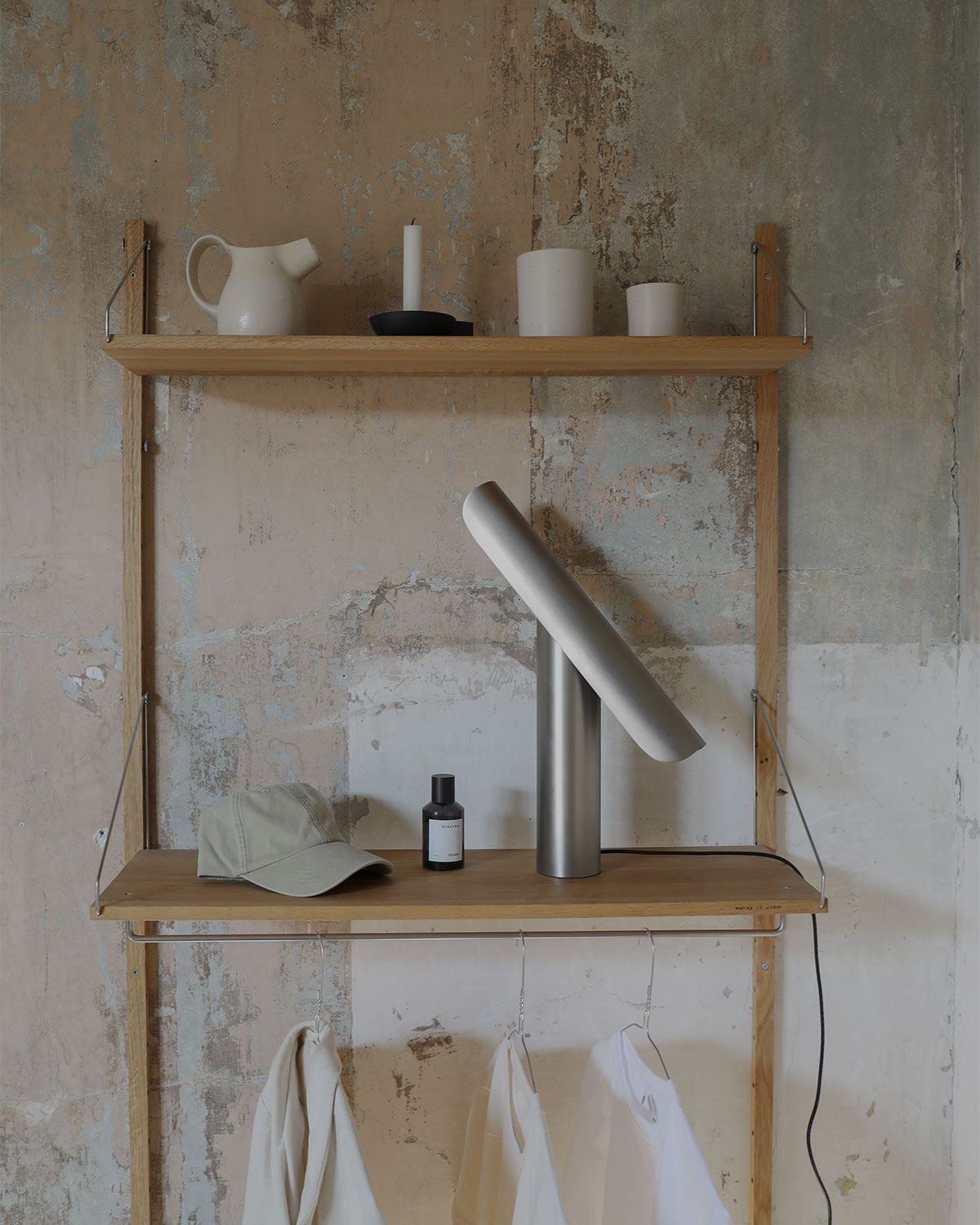 The T-lamp is a take on the archetypal desk lamp, with a simple mechanism allowing it to tilt and cast light from different angles. Although simplified to basic geometrical shapes, the lamp has a monumental appearance.
