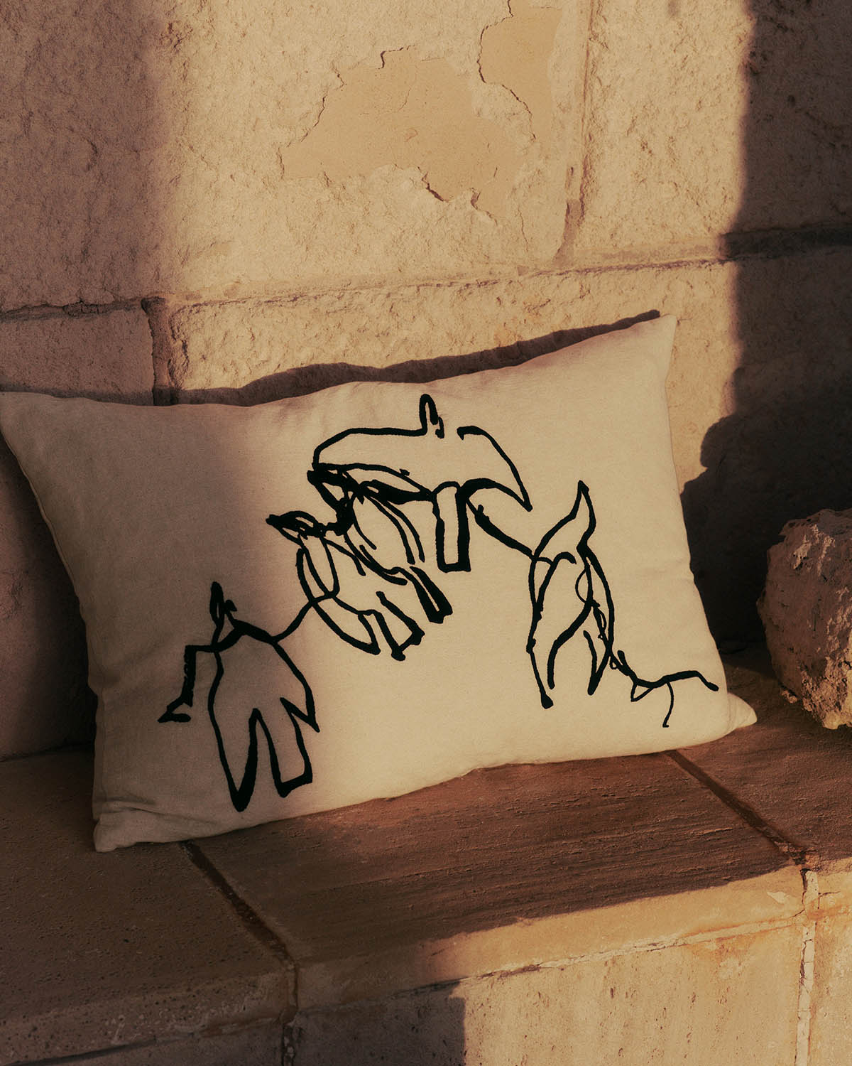 The Ferm Living x Utzon – Can Lis collaboration draws inspiration from architect Jørn Utzon’s family home in Mallorca, merging the natural environment with design elements that reflect his unique philosophy. The Vuelo Cushion pays homage to Utzon’s artistic sensitivity to natural forms, featuring embroidered artwork that reproduces his bird sketches created at Can Lis. ‘Vuelo’ references the Spanish word for ‘flight’ and captures the grace inherent to the bird motif. Crafted from chambray cotton-linen fabric in a rectangular format, the cushion features contrasting cotton thread embroidery, adding tactile and visual depth. The flowing lines of the bird sketches evoke movement and organic form, reflecting the spatial fluidity and openness of Can Lis.