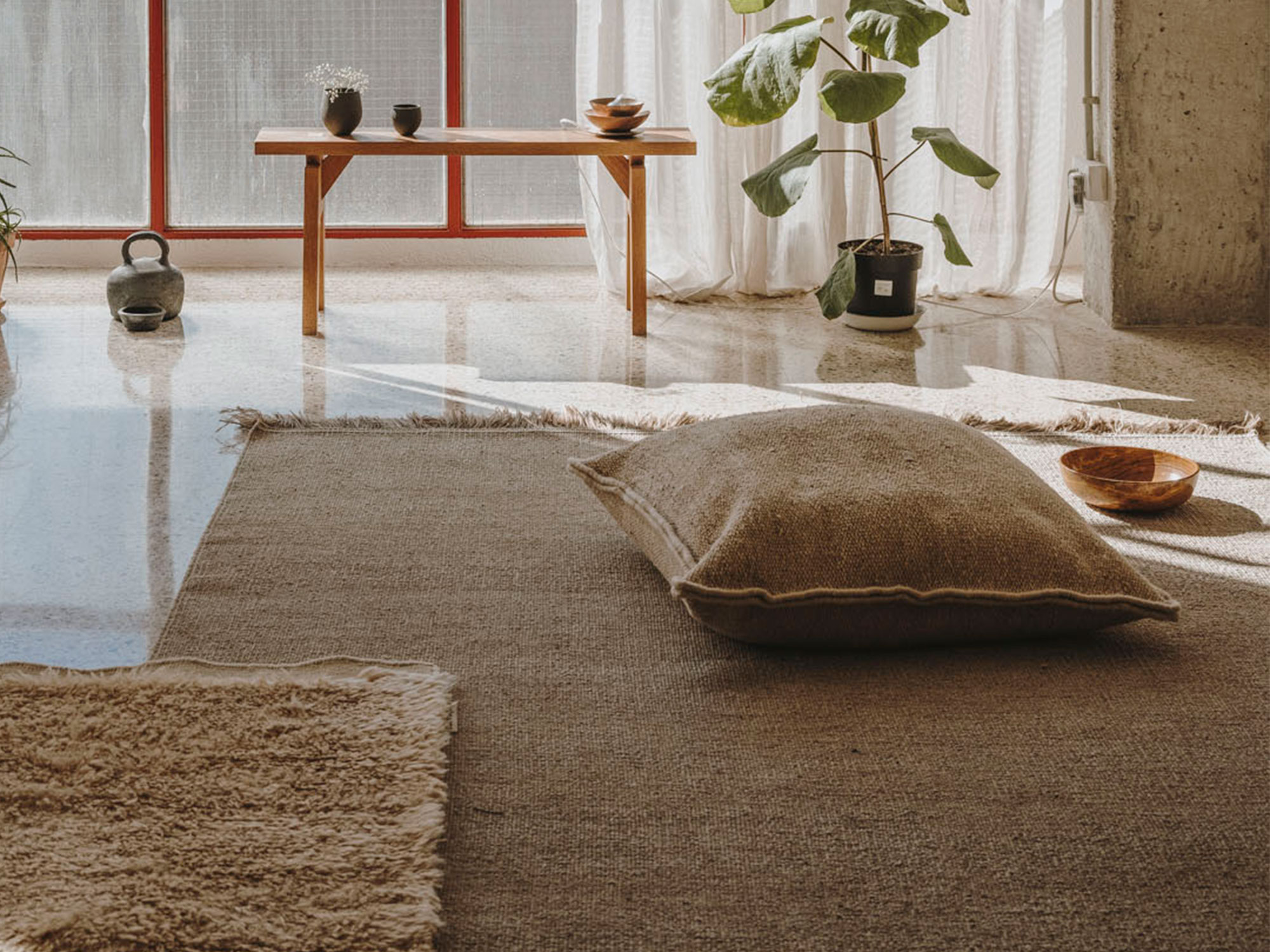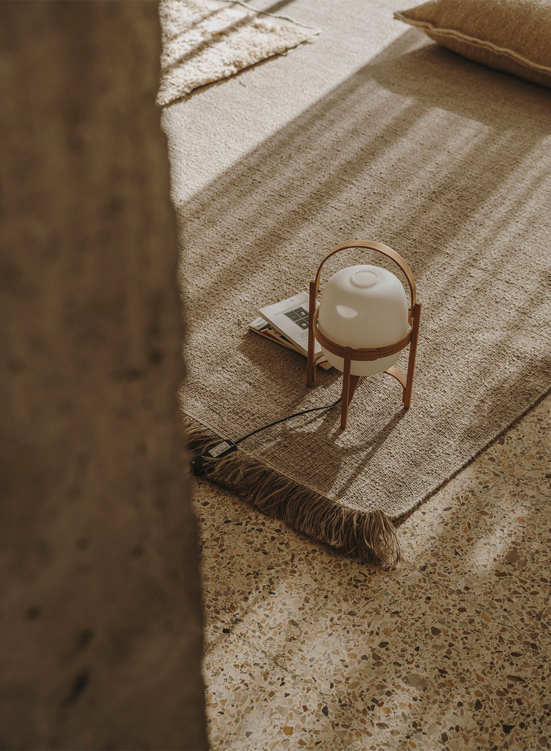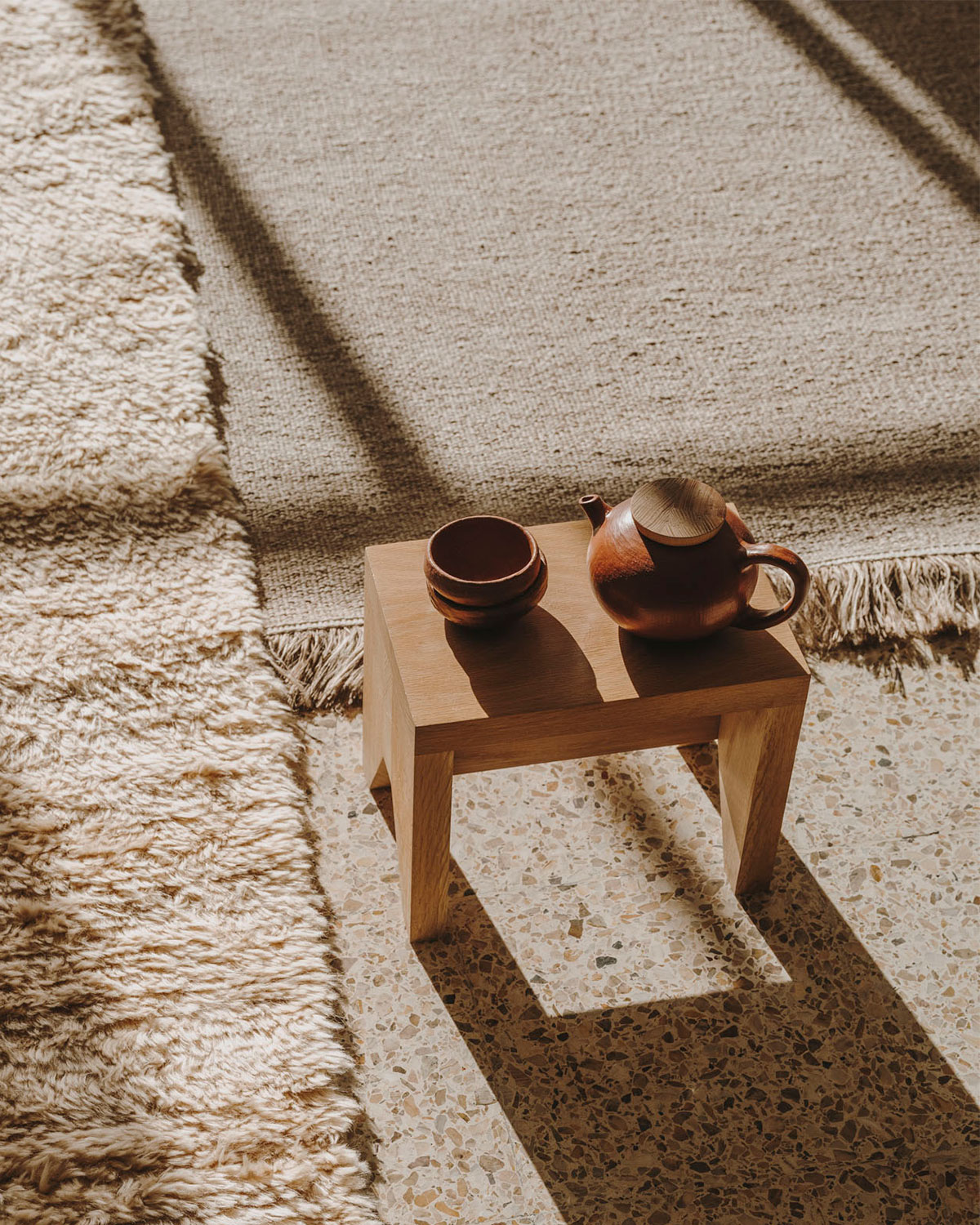 Wellbeing is an organism of comforting textile products that support the human experience. All the items focus on tactility, materiality, craft and quality. They add warmth, softness and comfort to indoor environments, and a connection to the senses. The collection uses traditional techniques and crafted details that make the normal special. The Wellbeing collection uses hand spun Afghan wool, nettle, jute, linen, Tussar silk as well as cork, wood, raw wool, and raw cotton carefully sourced by nanimarquina’s team, as close as possible to where the pieces from the collection are produced, using traditional craft techniques and local artisans with whom nanimarquina has worked with for a long time.